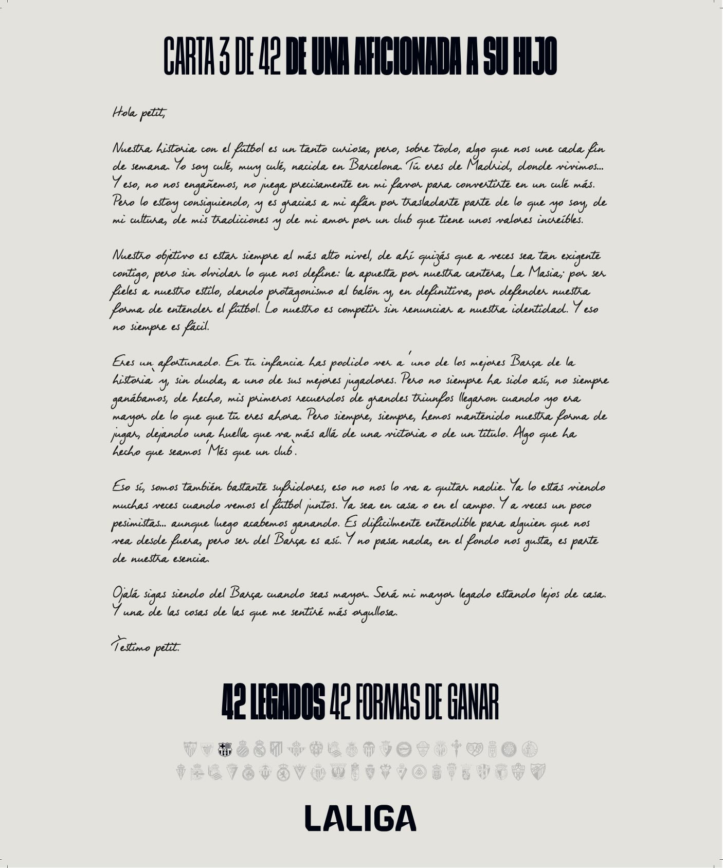 Por otro lado, los medios especializados As, Marca y Sport han publicado cartas reales de aficionados de los 42 clubes que forman parte de LaLiga. En ellas se aborda el sentimiento compartido entre padres e hijos por su club y cómo el fútbol se ha convertido en una parte fundamental de su relación. El Alavés, el Atlético de Madrid y el FC Barcelona protagonizan las primeras.