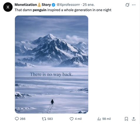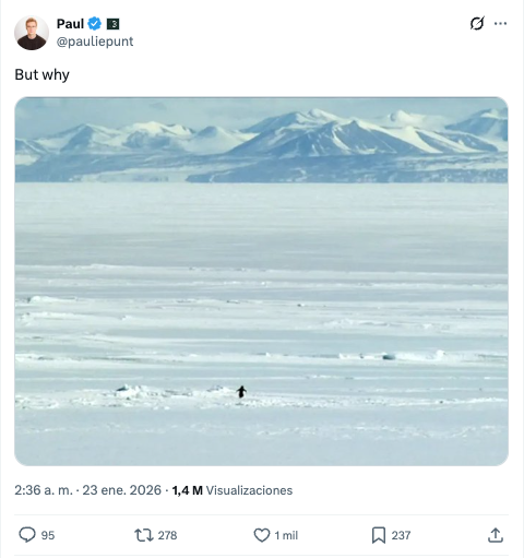 Es más, ese “But, why?" que formula Werner Herzog en su narración está acompañando a las interpretaciones que los usuarios están haciendo de la imagen. La gente ha compartido fotografías y vídeos del ya famoso pingüino, u otras creadas con inteligencia artificial, añadiendo comentarios como “cuando ya pasas de todo”, “sabe algo que nosotros no sabemos” o “yo alejándome de mis problemas”.