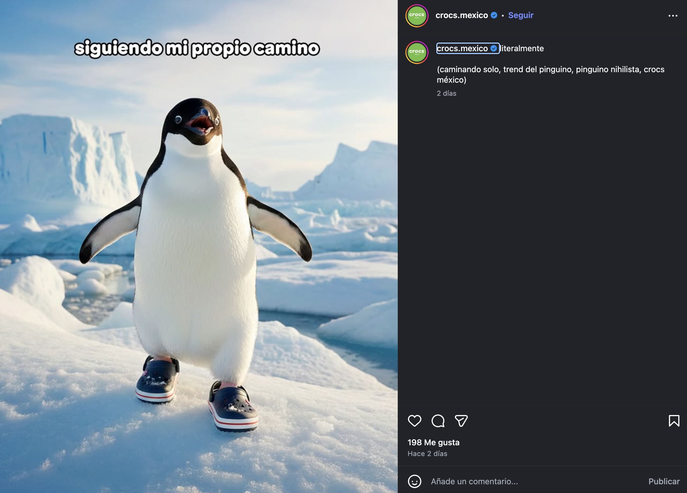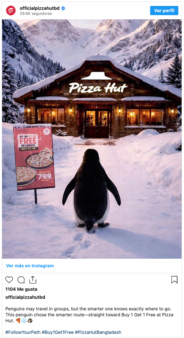 Esta versión del “pingüino nihilista” parece haber hecho virar las interpretaciones a nivel general, lo que ha llevado a muchas marcas a sumarse a la conversación para poner en valor sus productos. Better Balance lo ha hecho en México con su carne vegetal, al igual que Crocs con su calzado. También Pizza Hut o Lidl han situado los establecimientos al final de la caminata del pingüino, dando a entender que es lo que el ave estaba buscando.