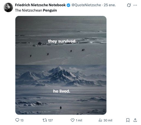 Sin embargo, en este comienzo de 2026, los usuarios de las redes sociales lo han vinculado a la filosofía. Esa inexplicable “marcha hacia la muerte” del pingüino se ha asociado, en un clima de incertidumbre y desasosiego, con el nihilismo, una corriente de pensamiento nacida en el siglo XIX que sostiene que la vida carece de significado y propósito y niega todo dogma religioso.