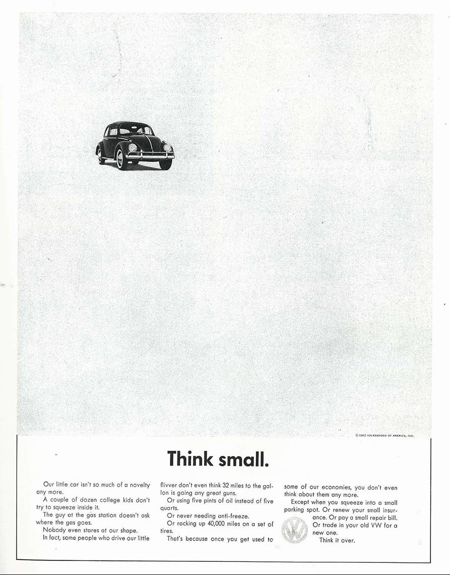 La gráfica evoca la estrategia y la estética de “Think small” (“Piensa en pequeño”), ideada por el publiciario Bill Bernbach y la agencia DDB en los años 60 para promocionar el modelo Beetle, y considerada una de las campañas de publicidad más influyentes de todos los tiempos.