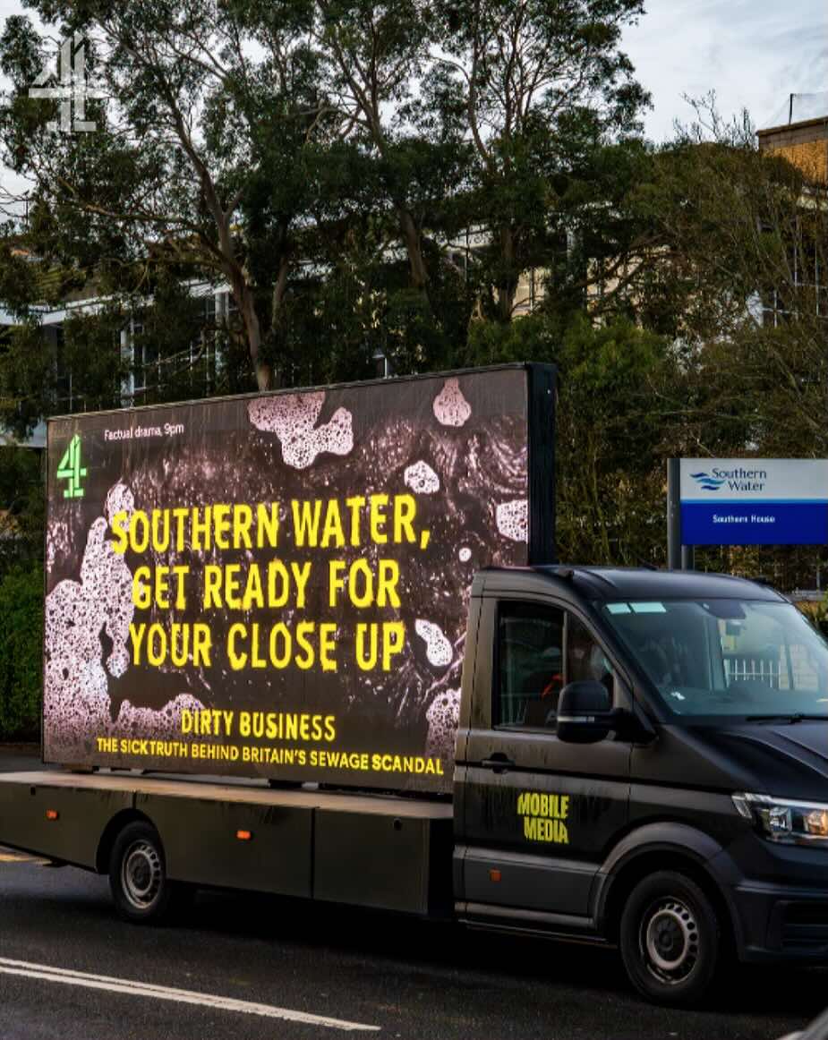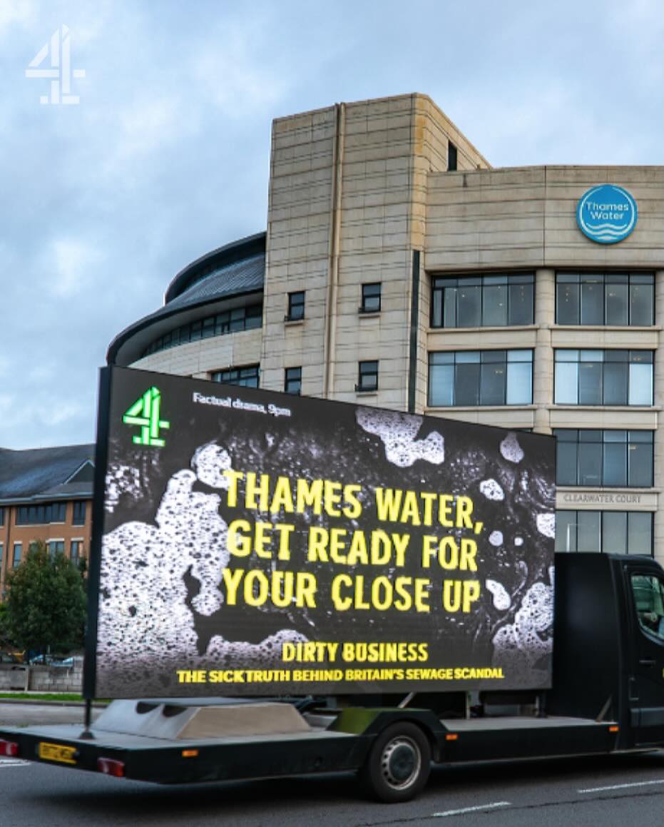 Además, la campaña incluye otras activaciones. Channel 4 también ha activado furgonetas publicitarias que han circulado por delante de las sedes de algunas compañías de agua con mensajes que advierte que se preparen para el escrutinio. Otras aparecerán en playas donde las compañías de agua han vertido aguas residuales con preguntas como "¿Te bañarías aquí?".