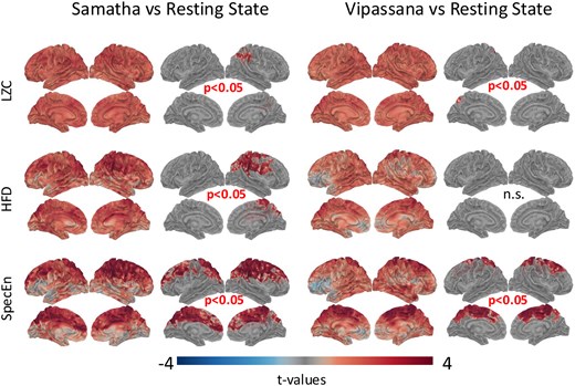Tanto en Samatha como en Vipassana se observa más riqueza y dinamismo en la señal cerebral. En el caso de Samatha, ese efecto es todavía más consistente en algunas regiones del cerebro.
