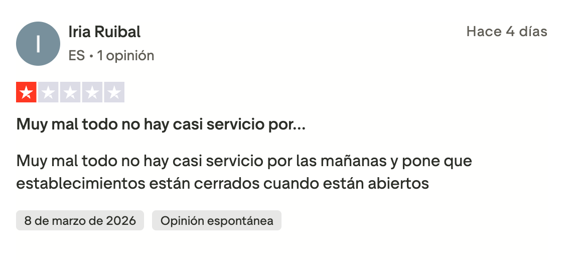 Algunas reseñas recientes reflejan ese malestar: “Si pudiera ponerles menos 100 estrellas, lo haría. Ya van cuatro veces que hago un pedido y me lo cancelan. El problema es que me lo cobran y a quién reclamas. Pésimo servicio”, señala una usuaria en una reseña publicada este mes de marzo. “No es la primera vez que pedimos y el repartidor no aparece o aparece casi dos horas después cuando la app decía 35 minutos”, comenta otra clienta en una valoración publicada en enero. “Más de una hora esperando mi pedido y al final me llaman diciendo que el turno del repartidor había terminado”, reclama otro usuario.