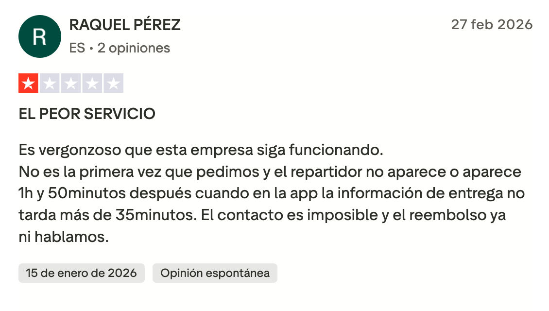 Pero en paralelo al cambio de modelo operativo, durante los últimos meses han proliferado en internet las críticas de usuarios relacionadas con la calidad del servicio. Entre los problemas más mencionados figuran retrasos prolongados, pedidos que nunca llegan o repartidores que no recogen los pedidos en los establecimientos.