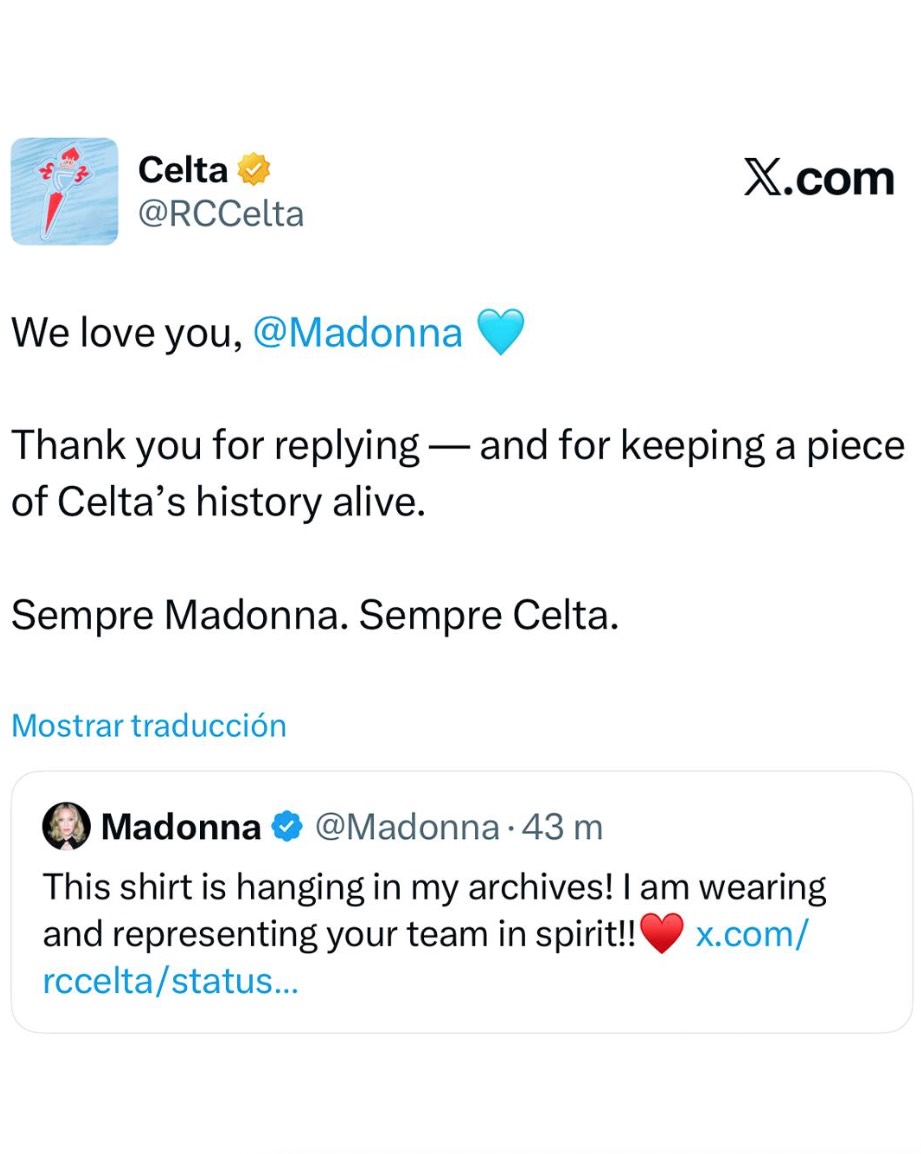 La estrategia ha cumplido el objetivo. Y es que al día siguiente de la actuación y del partido, Madonna respondió al Celta de Vigo. A través de una publicación en X, en la que compartía la versión de su canción, señalaba que contaba con la camiseta entre los objetos de su colección. “¡La llevo y represento a vuestro equipo con espíritu!”, señalaba Madonna.