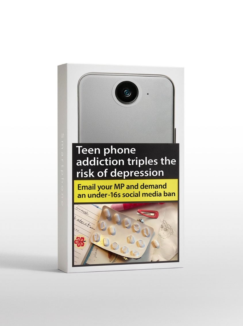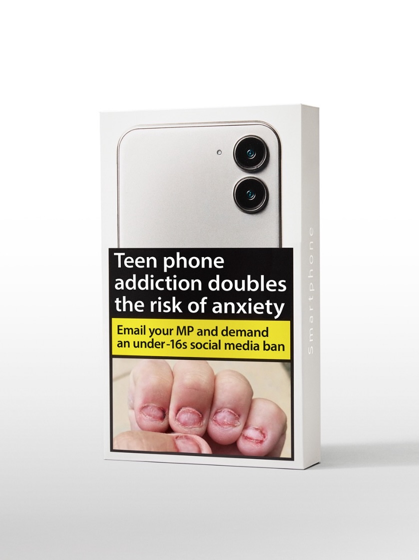 De la mano de la agencia creativa adam&eve\TBWA, ha creado una serie de gráficas con mensajes similares a los que figuran en los paquetes de cigarillos, pero en lugar de incluir los logotipos y diseños de las marcas de tabaco, muestran smartphones. Textos como “La adicción de los adolescentes al teléfono duplica el riesgo de ansiedad” o “Más de tres horas al día en redes sociales incrementa las probabilidades de autolesionarse”, se acompañan de imágenes como unas uñas mordidas al extremo, un blíster de pastillas o la foto de una joven en el hospital.