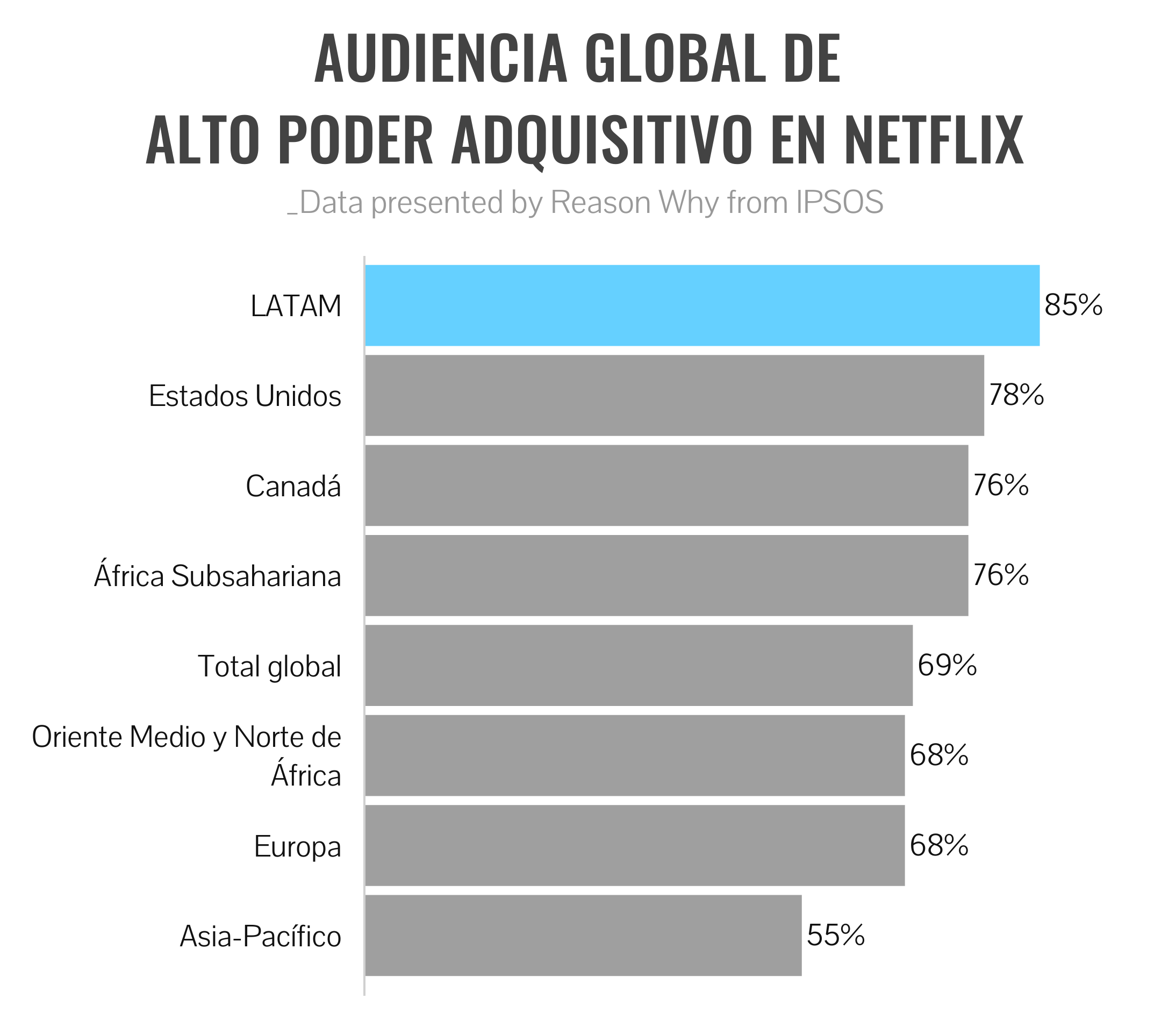 La escala sigue siendo el gran argumento competitivo. Netflix declara un alcance global cercano a los 1.000 millones de personas y 200.000 millones de horas consumidas anualmente. En el cuarto trimestre de 2025 alcanzó 315 millones de suscripciones de pago. Pero además del volumen, se trata también del perfil. Según datos recogidos por Warc a partir de Ipsos Global Influentials, Netflix ha logrado una penetración especialmente elevada entre individuos de alto patrimonio. A nivel global, el 69% de este segmento está suscrito a la plataforma, con picos del 85% en Latinoamérica y del 78% en Estados Unidos. Europa y la región MENA registran un 68% de penetración entre audiencias de alto poder adquisitivo, mientras que Asia-Pacífico presenta un 55%, lo que apunta a un margen relevante de crecimiento.