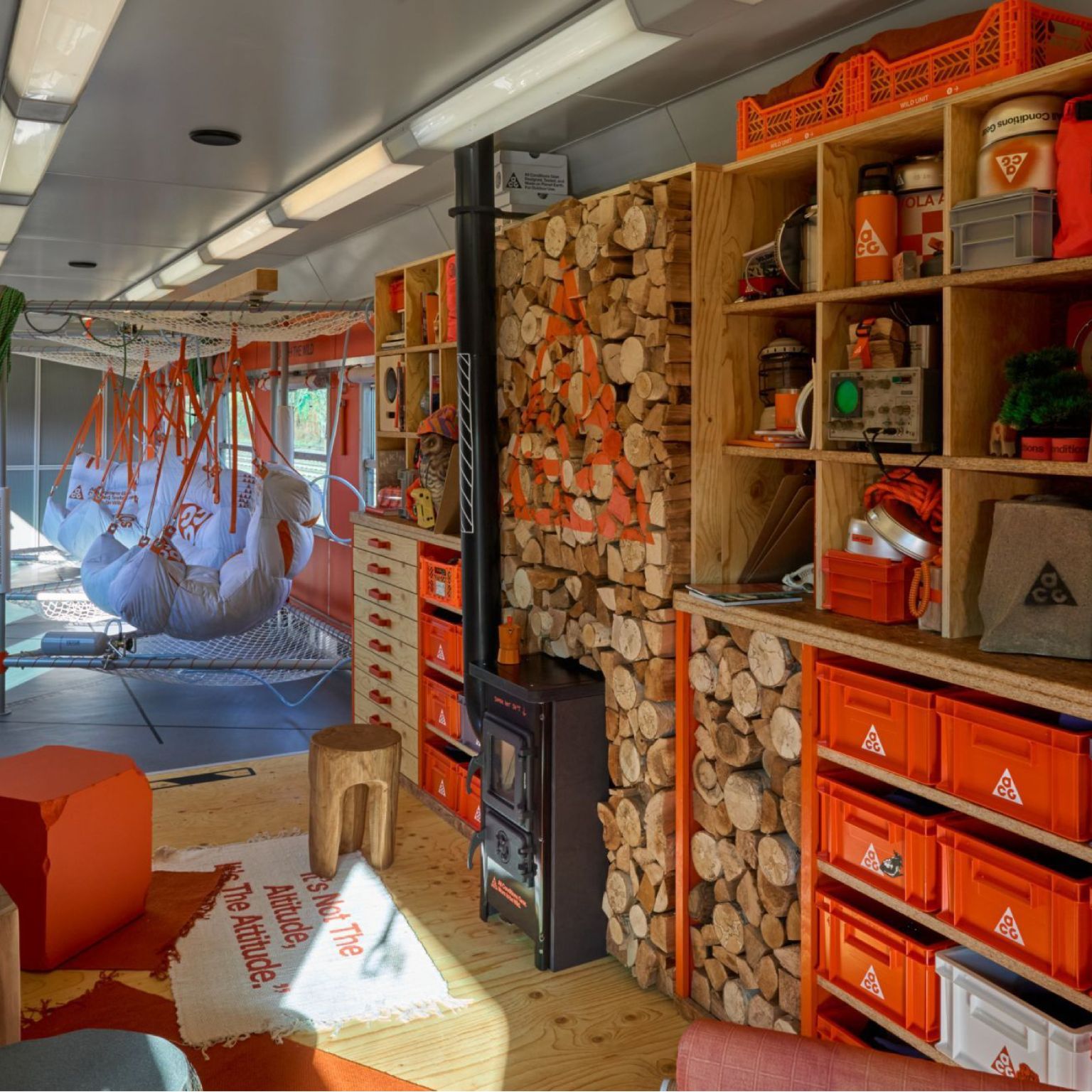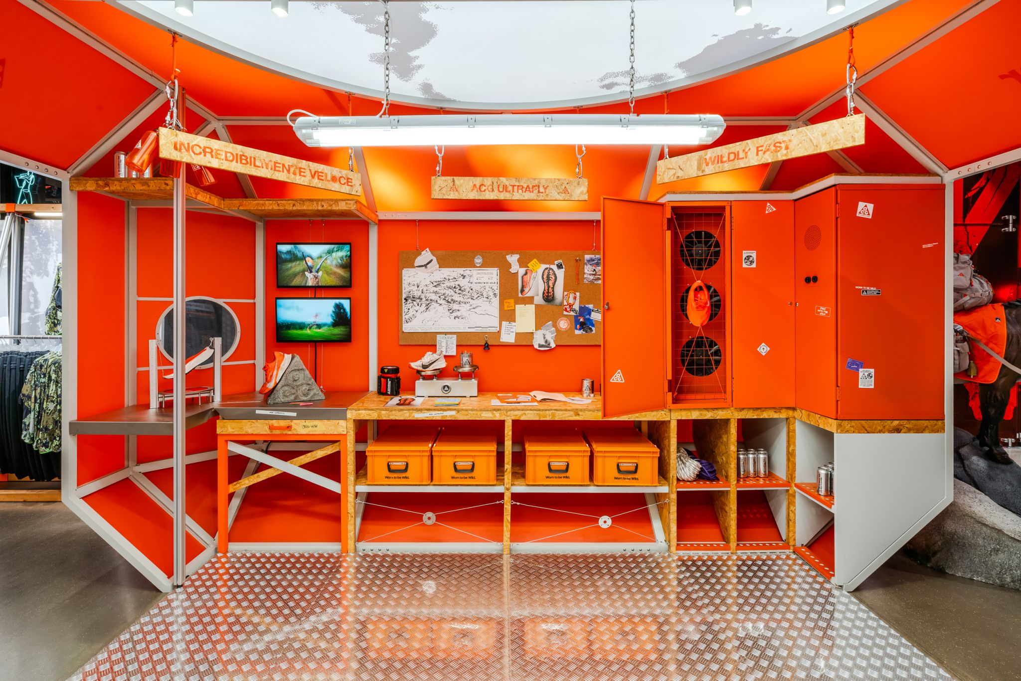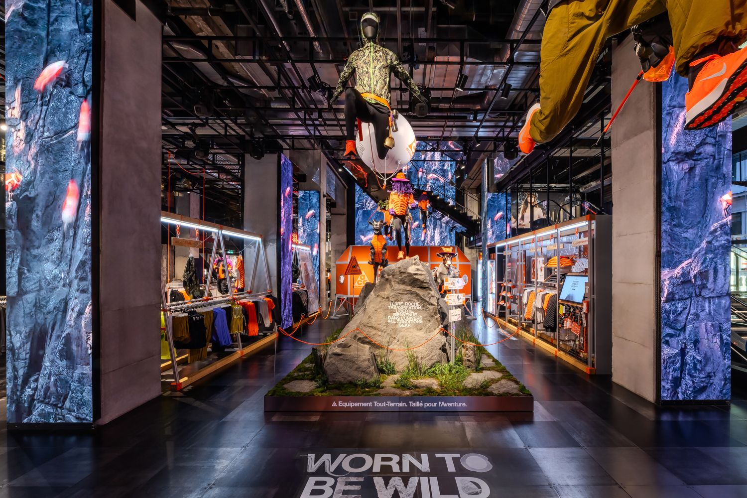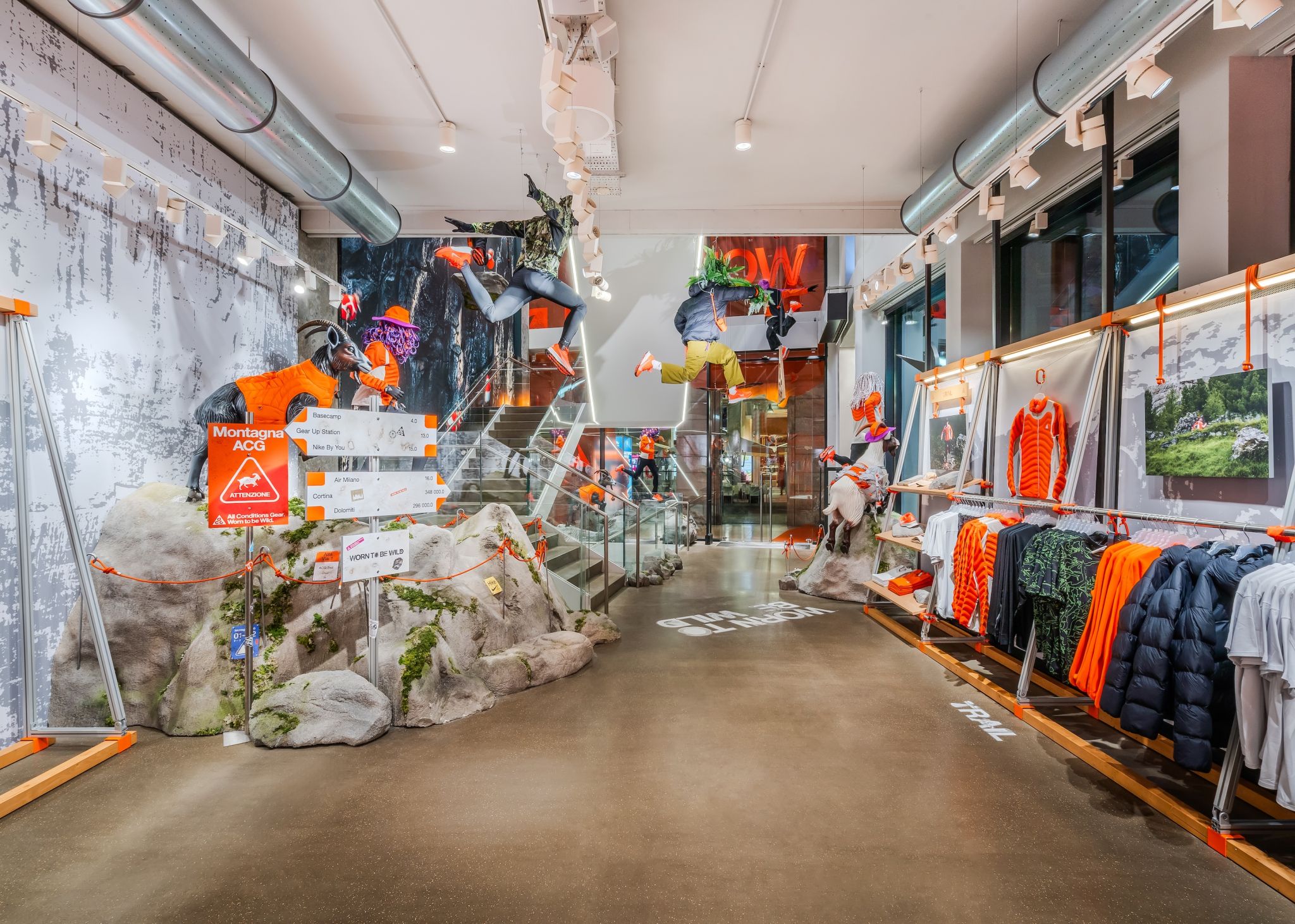 Los interiores de las tiendas de París, Milán, Londres o Nueva York presentan formas de rocosas que evocan a las montañas, maniquíes en posiciones y niveles que reflejan el deporte al aire libre, detalles naturales o, incluso, esculturas de animales, como osos y cabras. Todo ello se conjuga con el naranja corporativo de la marca y ambientes que emulan el interior de tiendas de campaña o refugios de alto nivel técnico.