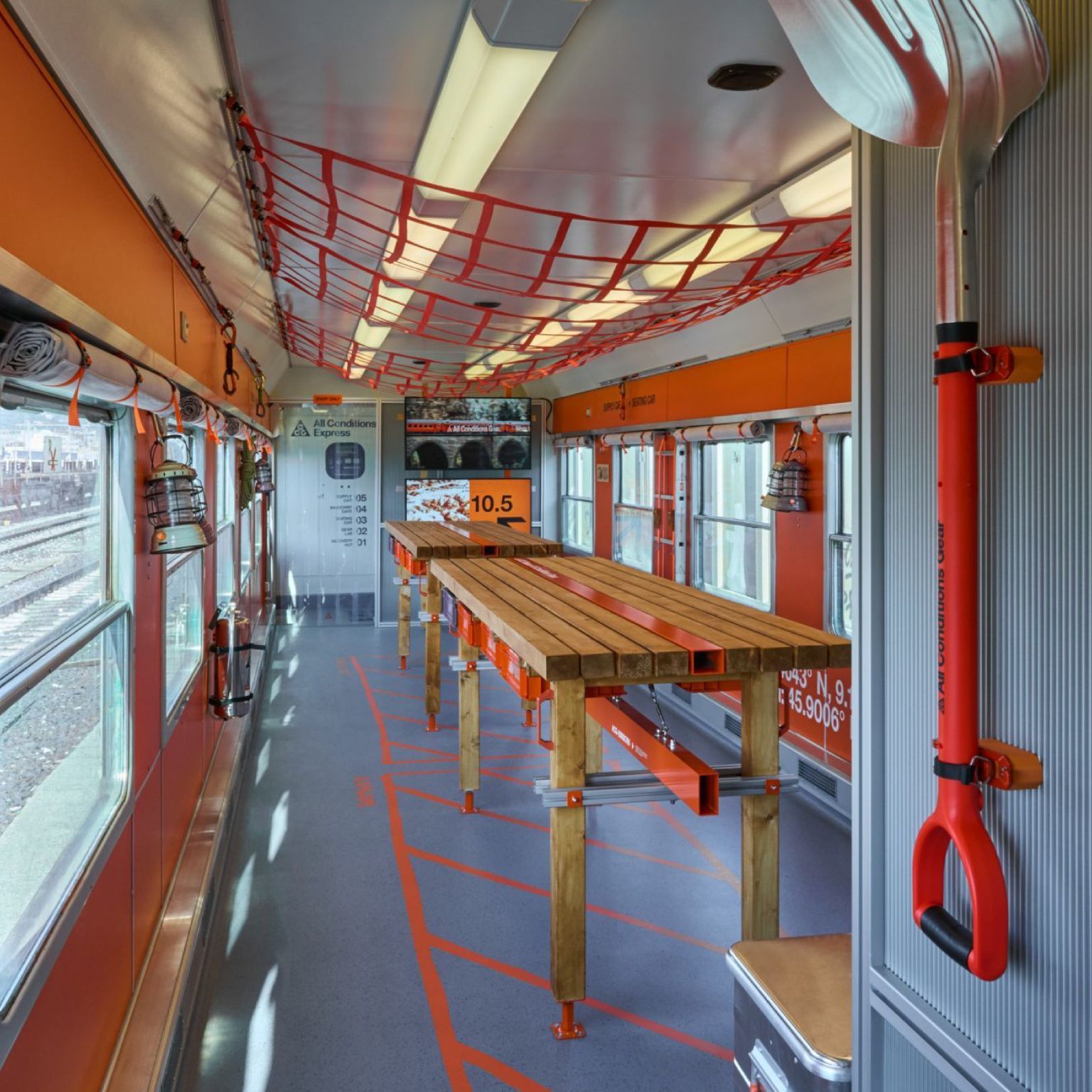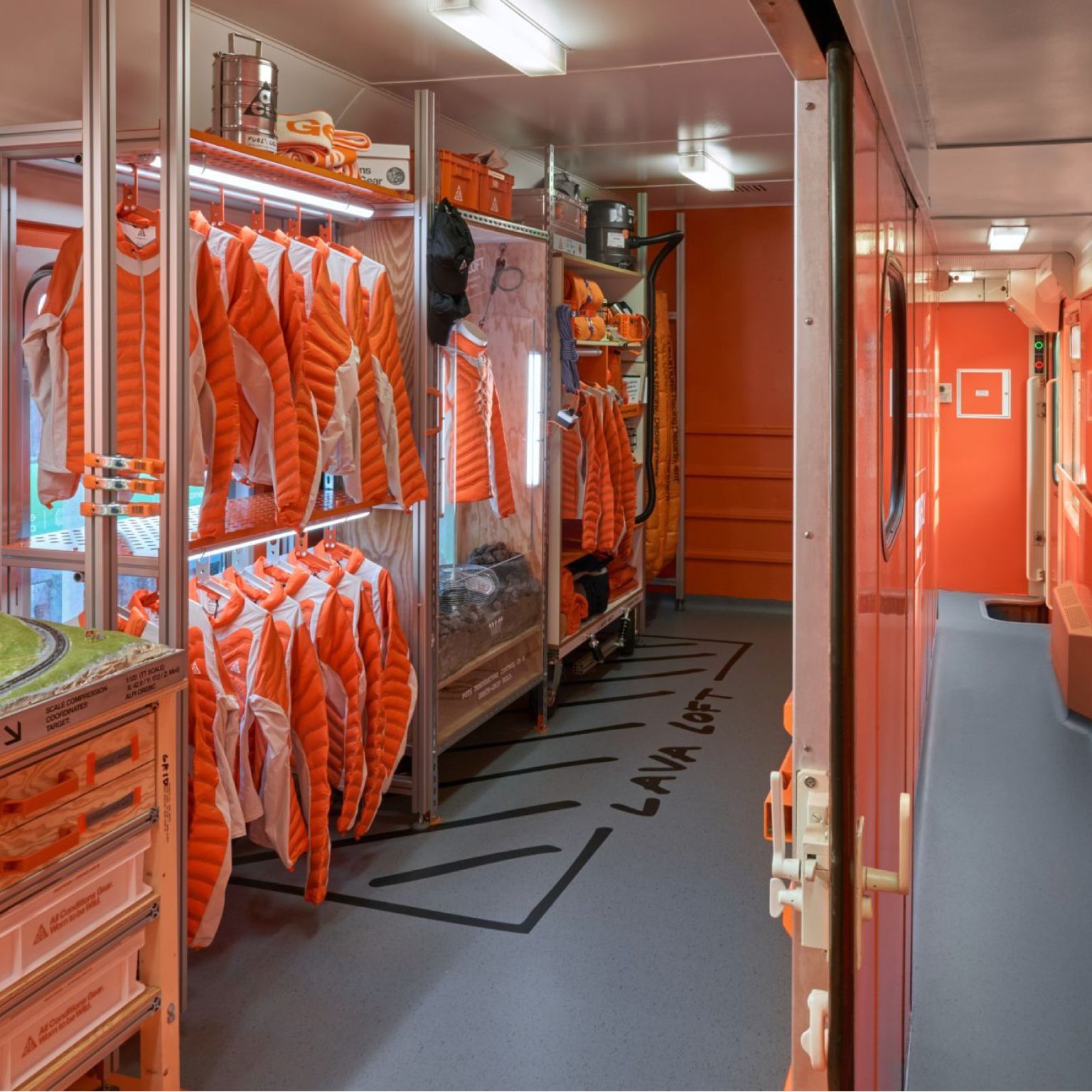 Así, la cafetería ha sido rediseñada inspirándose en los refugios alpinos clásicos, con meses altas de madera; mientras que en otros vagón se han establecido tienda de recuerdos con camisetas, postales, parches, pegatinas, bolsas y otro merchandising de la marca. El tren también incluía una zona de recuperación con varias opciones de asientos, incluyendo un amplio sofá cama para varias personas, sillas colgantes y sillas giratorias tapizadas, además de prismáticos para contemplar el paisaje. Otros vagones incluían una sala de almacenamiento de equipo, y una versión en miniatura del tren.
