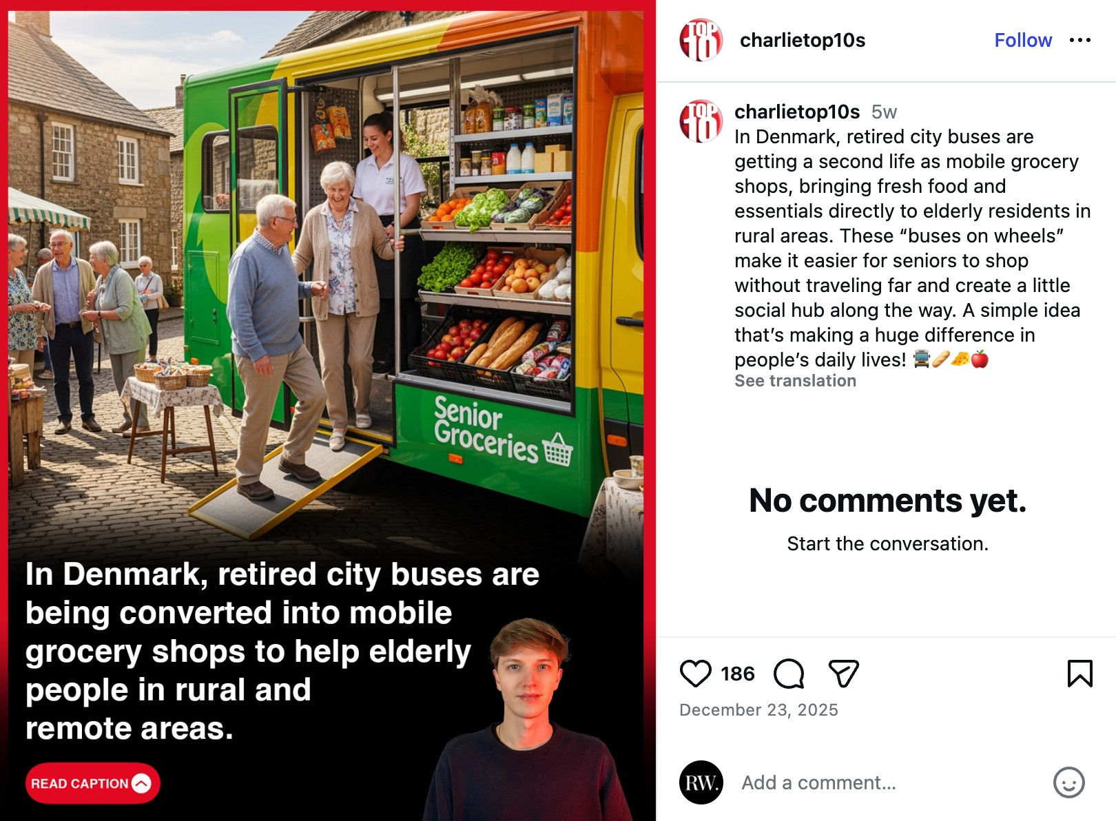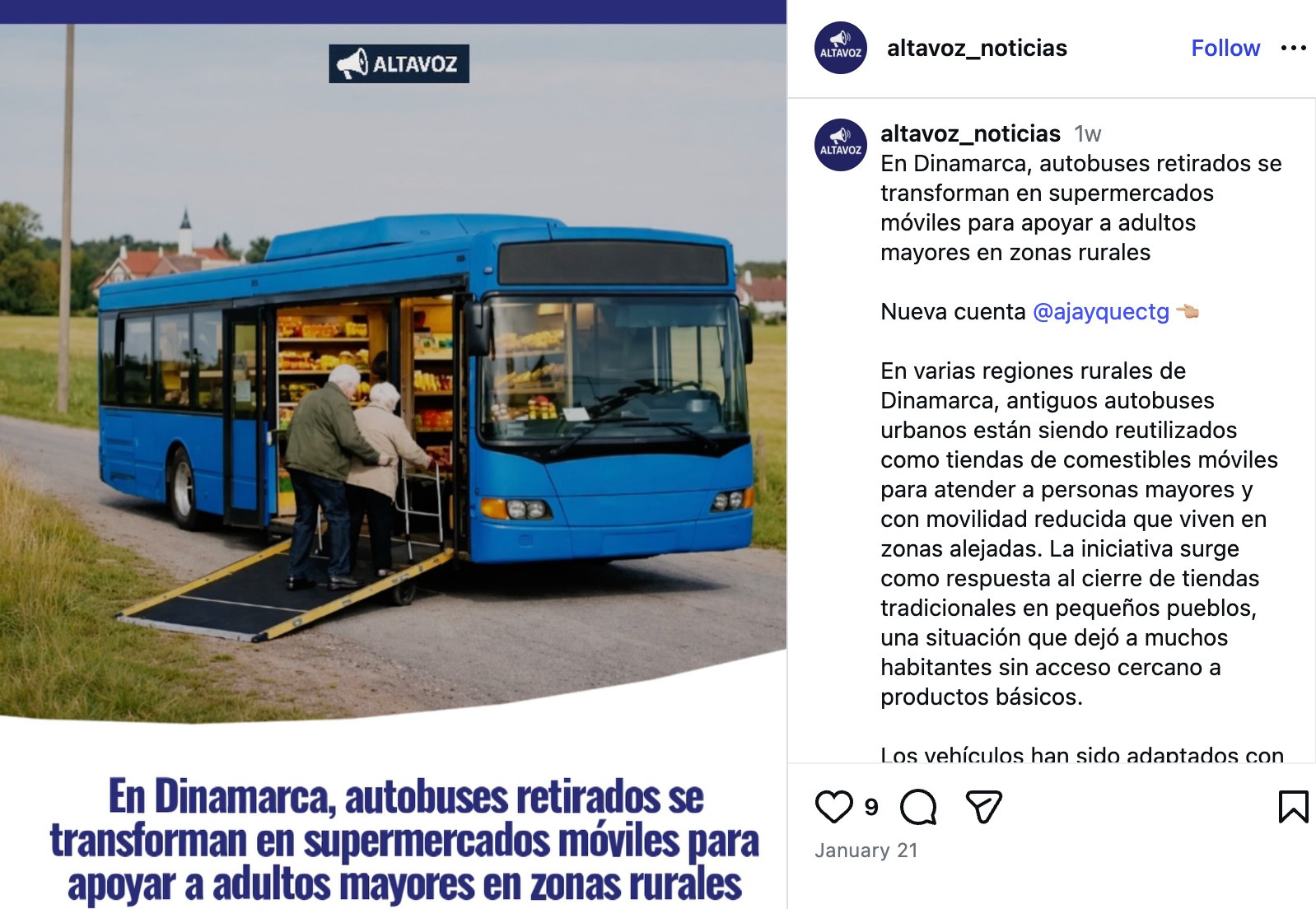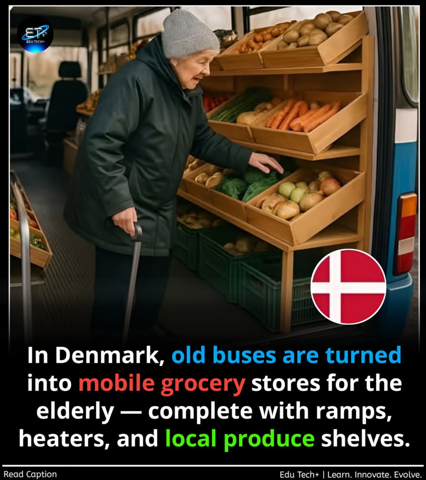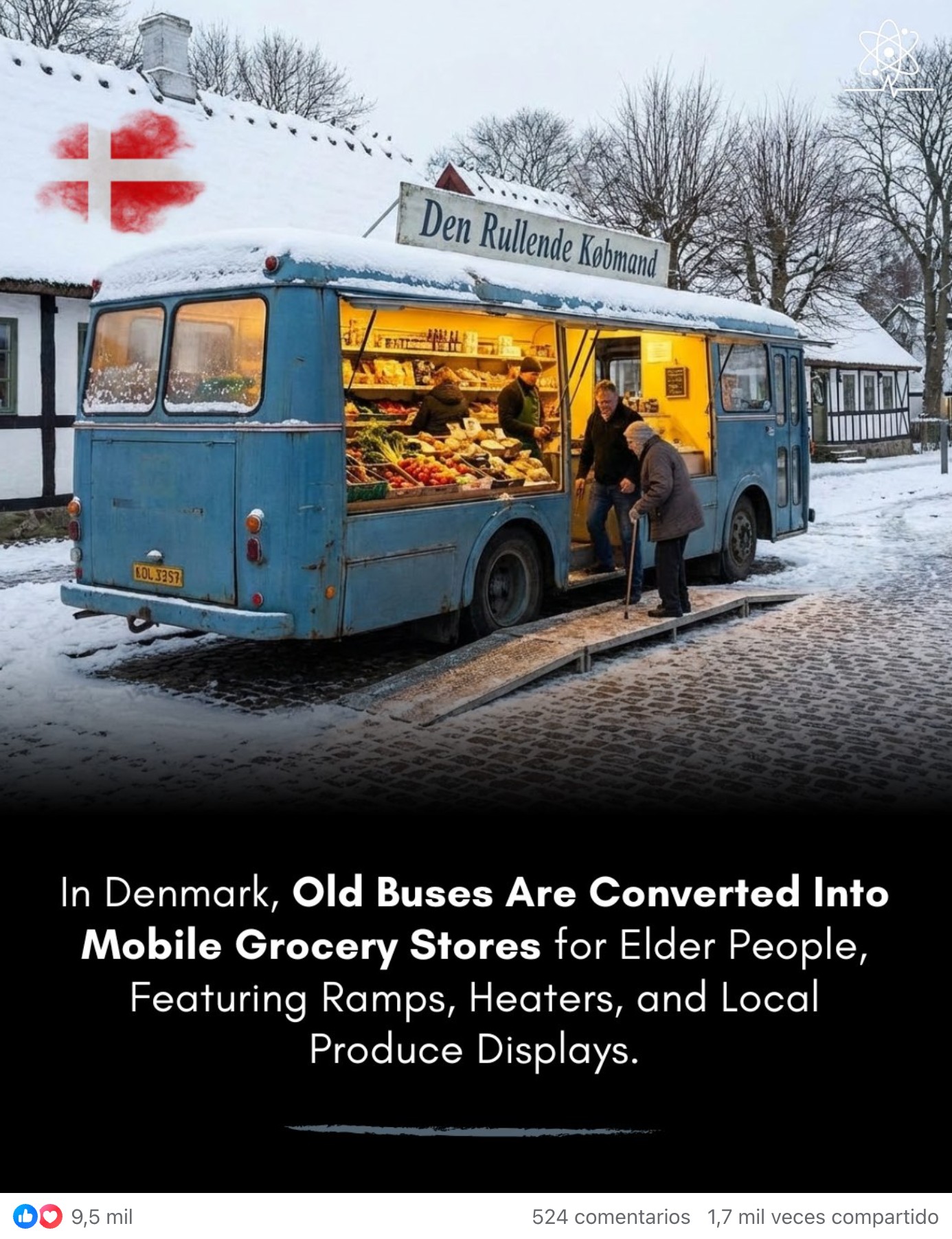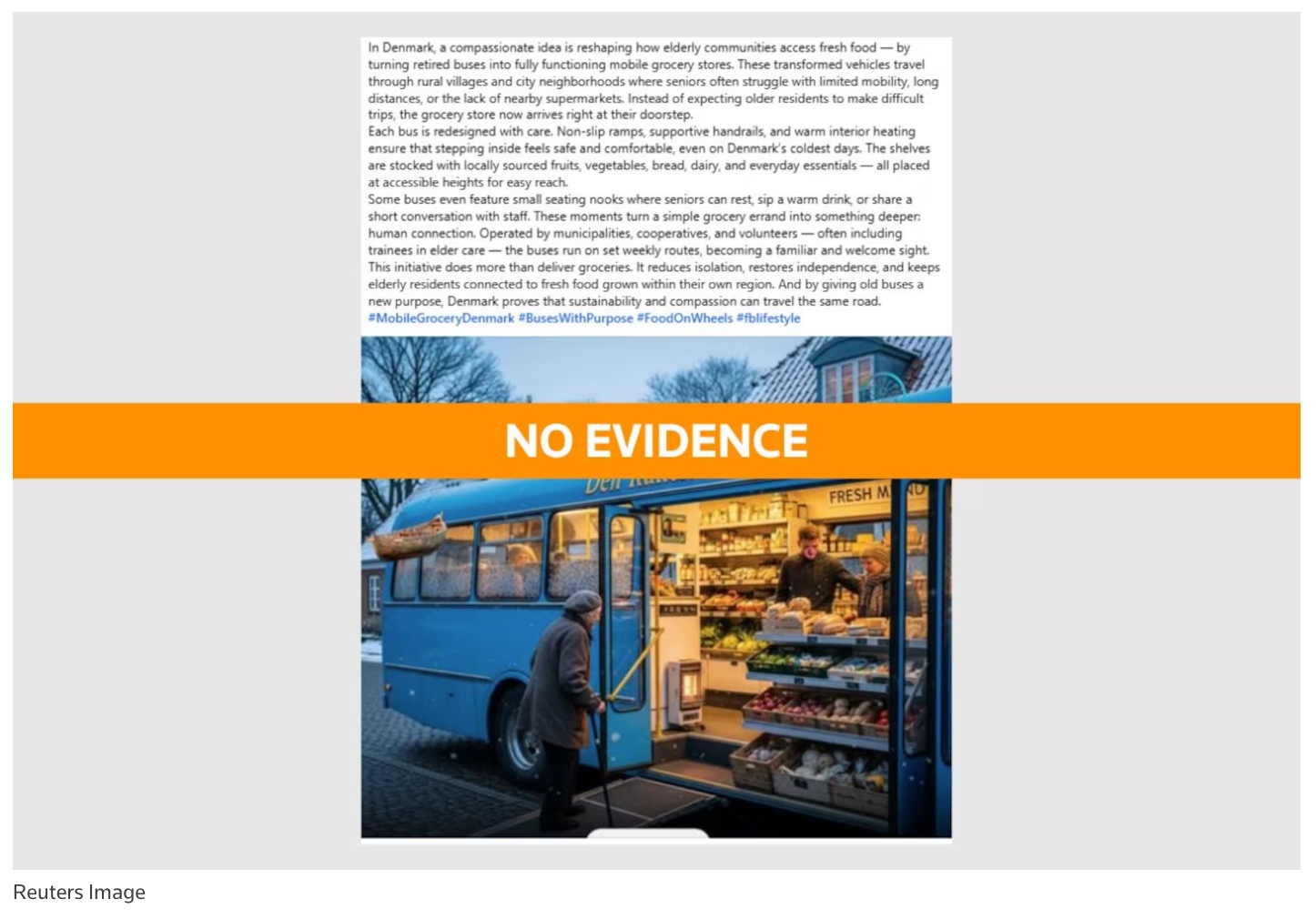 El post asegura que Dinamarca ha convertido autobuses dados de baja en supermercados móviles para llevar alimentos frescos a personas mayores en zonas rurales. Para ilustrar el supuesto hecho, se utiliza una imagen generada de forma evidente mediante Inteligencia Artificial, sin mención a su origen, sin fuente y sin un solo dato contrastable que avale una iniciativa de tal magnitud a nivel nacional en un país europeo.