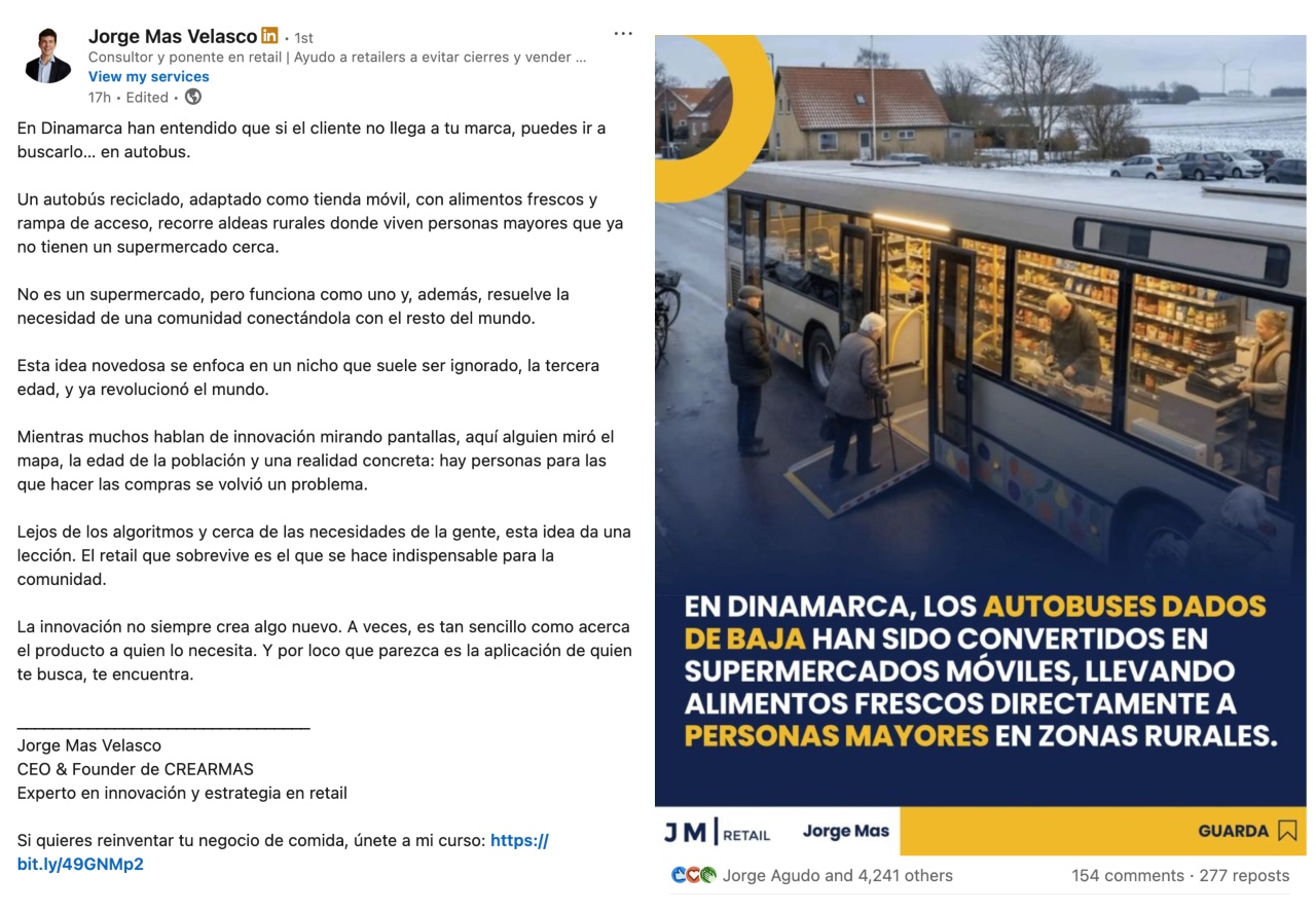 Tras la publicación de este artículo, el autor del post ha editado su publicación en Linkedin añadiendo un párrafo final en el que menciona que la iniciativa de los autobuses convertidos en supermercados no corresponde a un proyecto real implantado en Dinamarca; y menciona la verificación de Reuters publicada en diciembre de 2025 y a la que hemos hecho referencia desde Reason.Why, en la que se confirma que no existe evidencia de su implementación a gran escala.