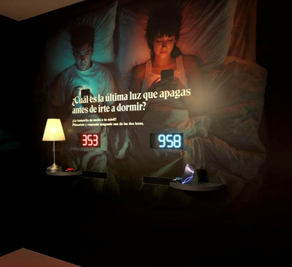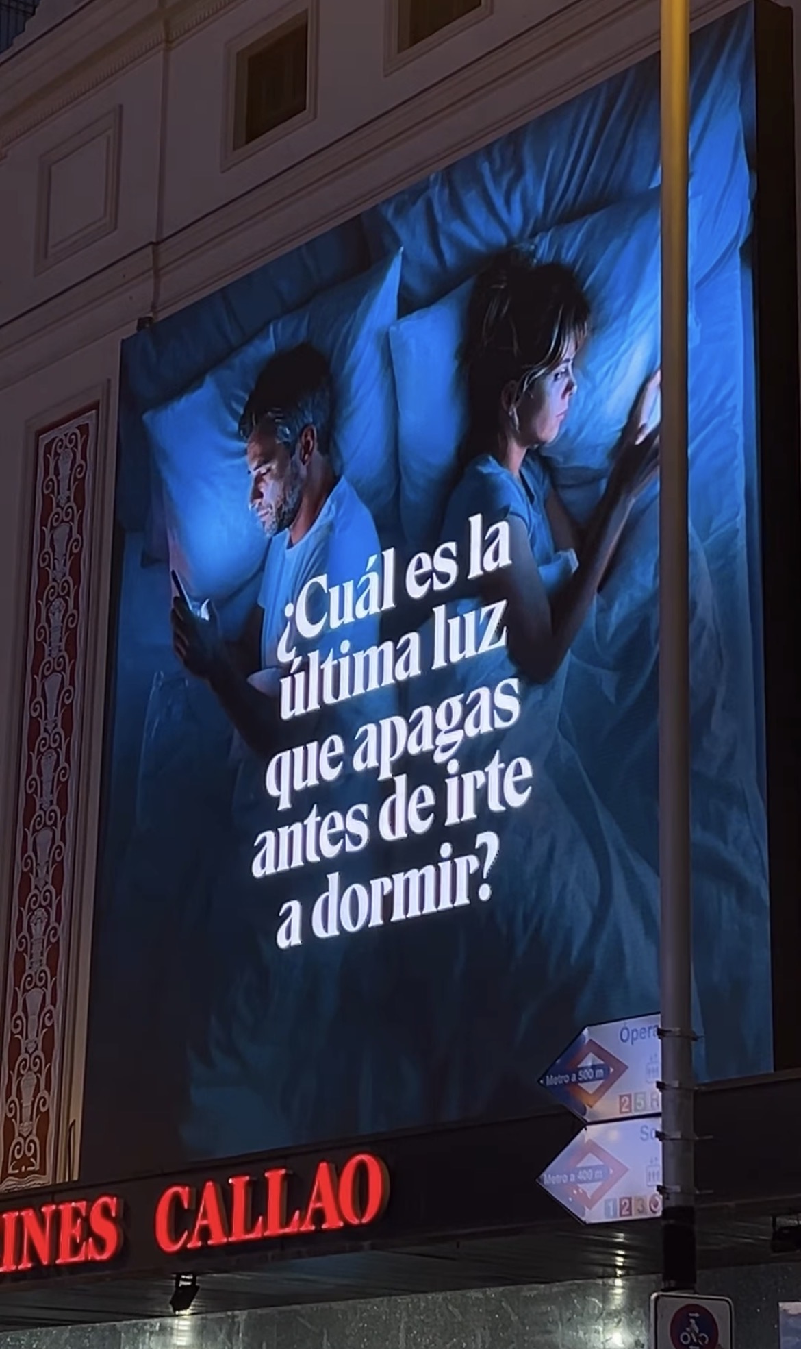 Antes de quedar en negro, los soportes lanzaron mensajes que invitaban a reflexionar sobre la intimidad y los hábitos nocturnos. Y tras una cuenta atrás, llegaba el silencio visual. La intervención ha buscado trasladar al espacio urbano una rutina doméstica cada vez más normalizada: la presencia constante de pantallas en el dormitorio.