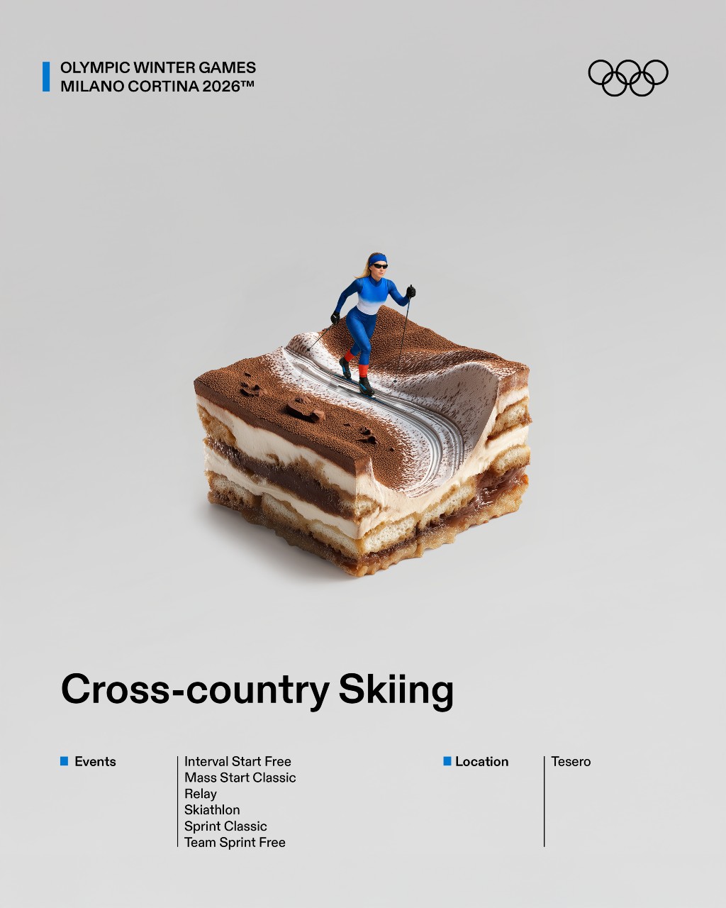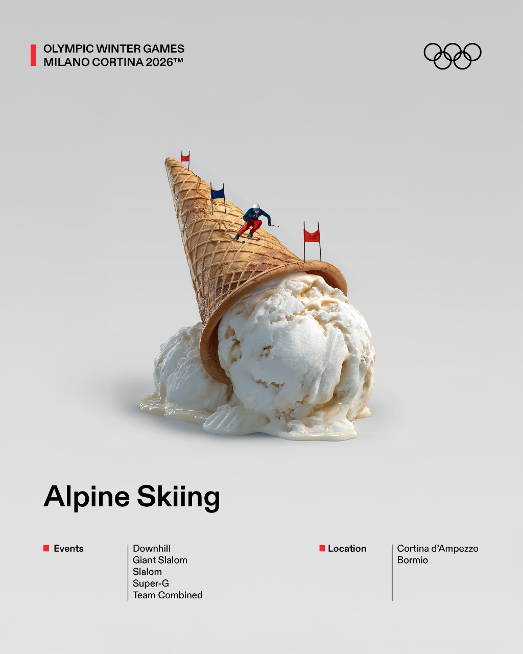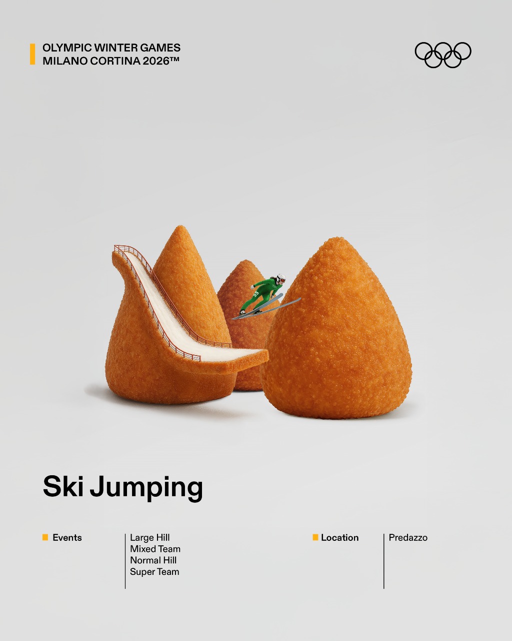 El planteamiento parte de una observación estratégica: muchos deportes de invierno siguen siendo percibidos como lejanos o minoritarios para amplias capas del público. Frente a una aproximación explicativa o técnica, el proyecto propone un cambio de lenguaje: traducir esas disciplinas a través de códigos culturales ampliamente reconocibles. Gastronomía, referencias populares, estética visual y humor funcionan como herramientas para generar familiaridad y reducir la distancia entre el deporte y la audiencia. La iniciativa se materializa en 16 gráficas ilustradas, cada una dedicada a un deporte olímpico de invierno y reinterpretada desde el imaginario italiano.