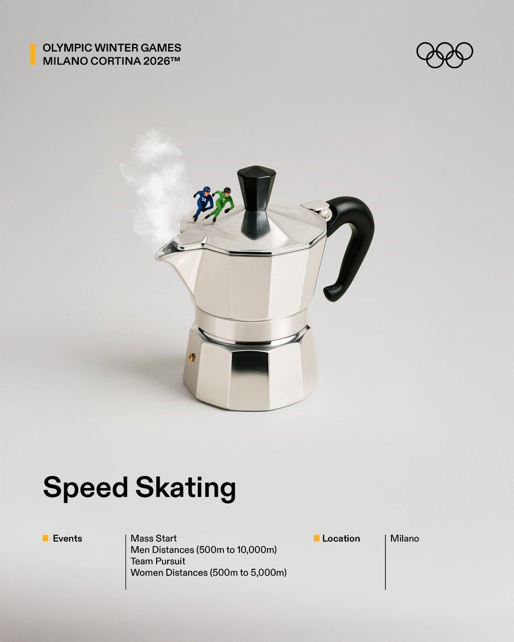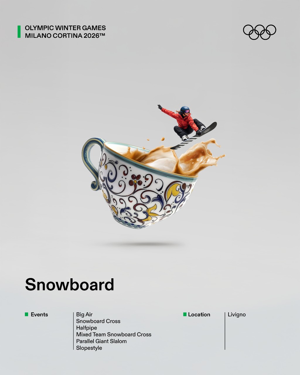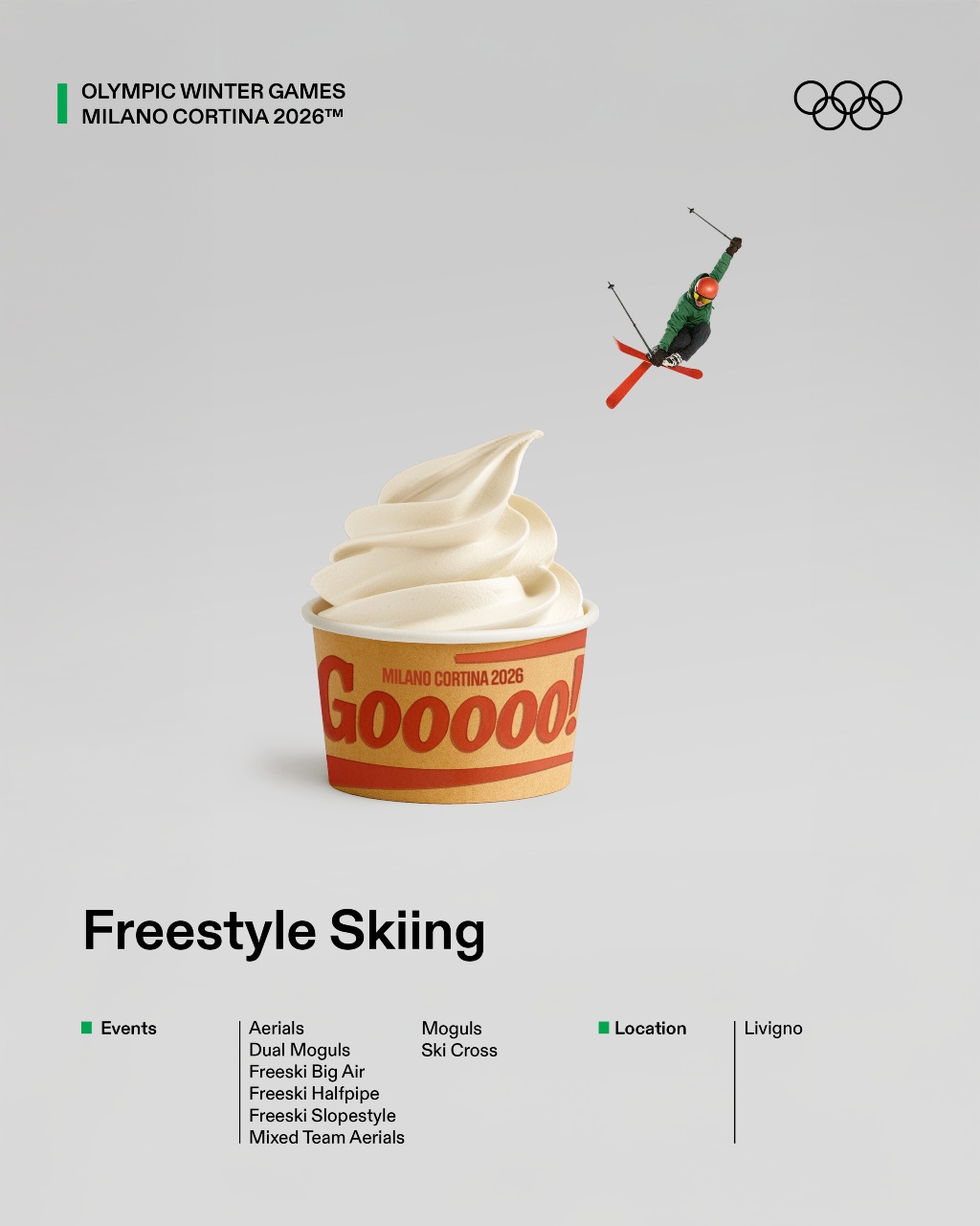 El planteamiento parte de una observación estratégica: muchos deportes de invierno siguen siendo percibidos como lejanos o minoritarios para amplias capas del público. Frente a una aproximación explicativa o técnica, el proyecto propone un cambio de lenguaje: traducir esas disciplinas a través de códigos culturales ampliamente reconocibles. Gastronomía, referencias populares, estética visual y humor funcionan como herramientas para generar familiaridad y reducir la distancia entre el deporte y la audiencia. La iniciativa se materializa en 16 gráficas ilustradas, cada una dedicada a un deporte olímpico de invierno y reinterpretada desde el imaginario italiano.