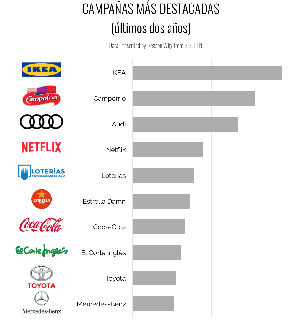 En segundo, tercer y cuarto lugar están Ikea, Apple y Campofrío. Las tres conservan su lugar en el ranking, en ese mismo orden. Cerrando el top 5 se cuela Nike, que sube dos posiciones con respecto al estudio de hace dos años. Las subidas más notorias han sido las protagonizadas por Netflix (que escala al séptimo puesto, viniendo del 34 en la anterior edición) y BBVA que esta vez consigue la décima posición, desde un anterior puesto número 27.