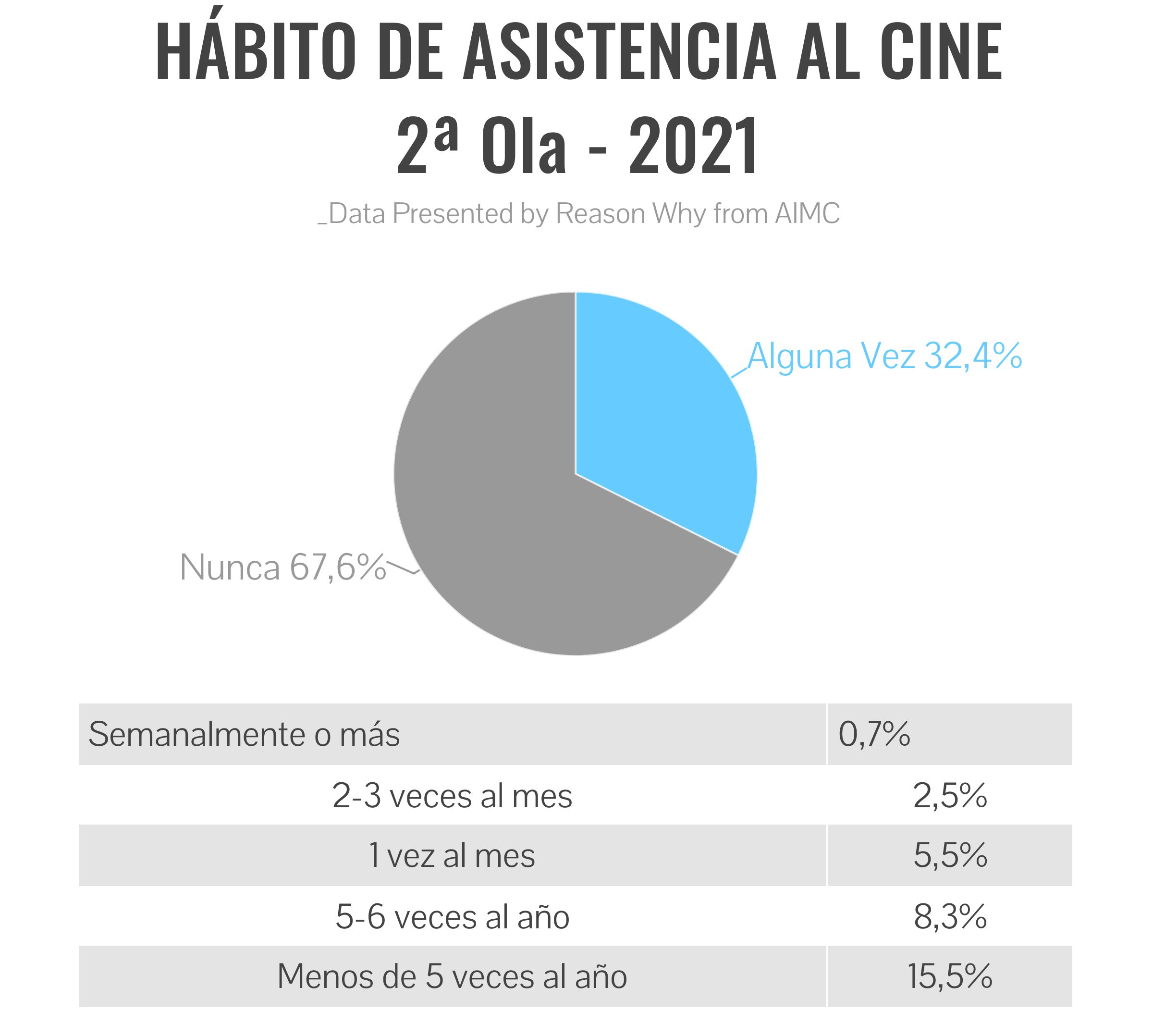 No obstante, el contexto de miedo al contagio generado por la pandemia ha incrementado el porcentaje de personas que aseguran no ir nunca o casi nunca al cine, que en esta edición del EGM se sitúa en el 67,6%, respecto al 66,1% de la anterior oleada. Tan solo el 0,7% afirman ir al cine al menos una vez a la semana y el 15,5% aseguran que acuden menos de 5 veces al año.