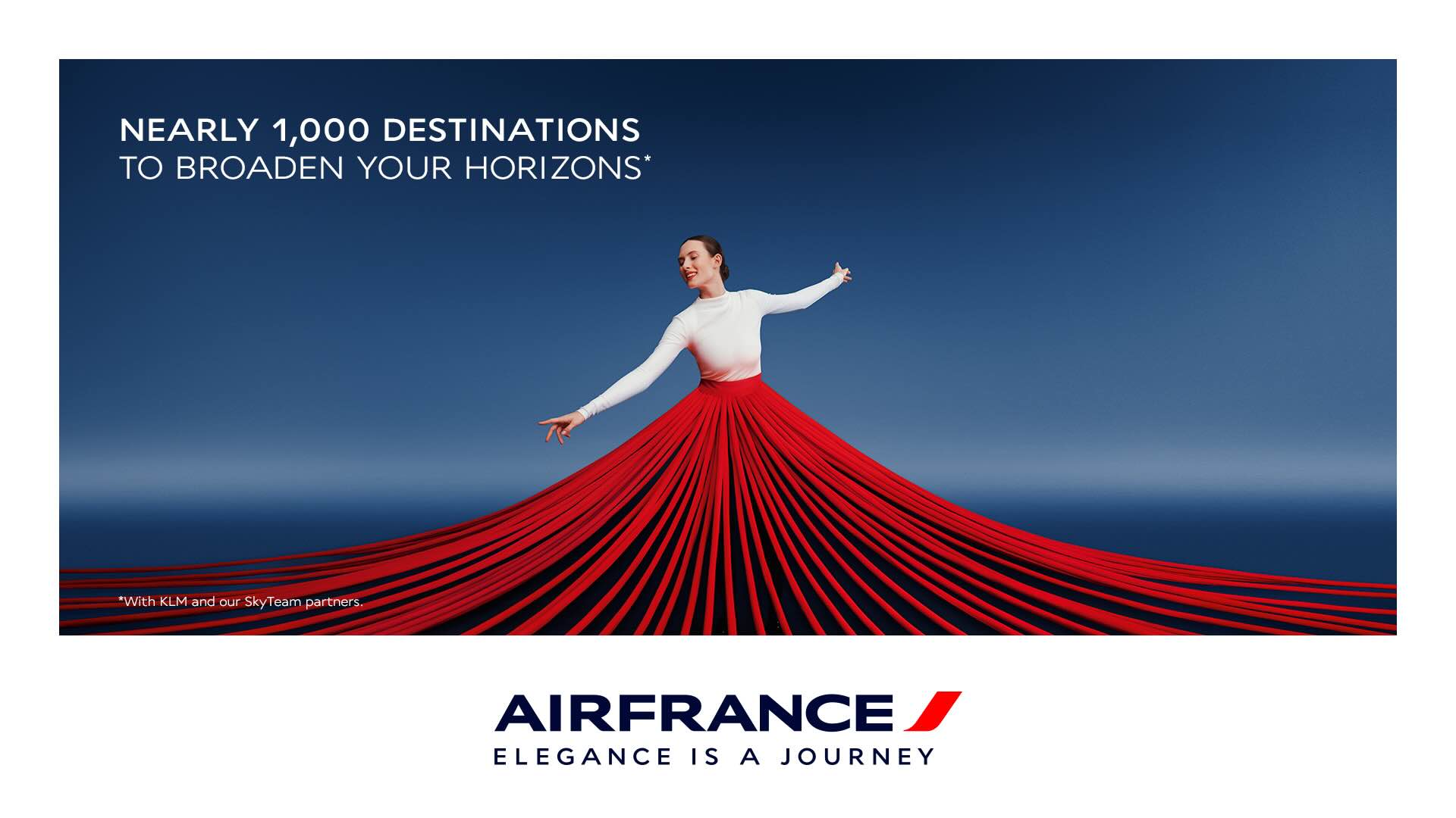 La campaña cuenta con una imagen principal, que ha sido creada por los fotógrafos Sofia Sanchez y Mauro Mongiello, y que contará con su versión en vídeo y en vídeo 3D. En ella se muestra la Torre Eiffel, símbolo universal de Francia, y una mujer ataviada con un vestido rojo, cuya cola ondea al viento. Con ello, se busca consolidar el lema publicitario de la aerolínea, “La elegancia es un viaje. Air France”.