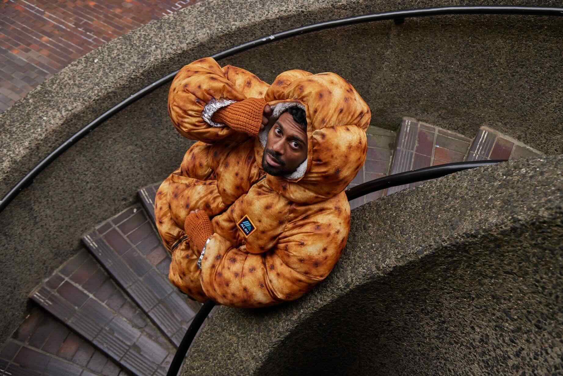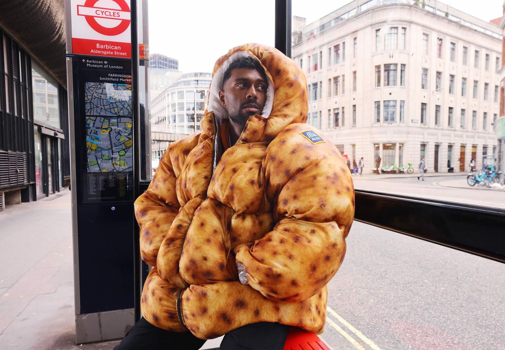 Además, las mangas terminan en mitones marrones extensibles y puños plateados, creando la apariencia de una patata asada envuelta en papel de aluminio. Por otro lado, la prenda también incluye una funda plateada para la lluvia que recuerda a dicho papel de aluminio necesario para hornear la patata.