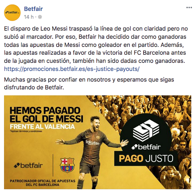 De esta forma, Betfair se ha introducido en la conversación de miles de personas sobre si el gol anulado a Messi debió de subir al marcador en el partido disputado el pasado domingo entre el FC Barcelona y el Valencia.