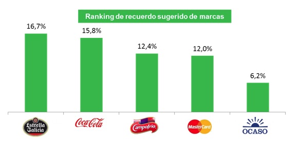 En cuanto al recuerdo sugerido de marcas, Coca-Cola pierde el liderazgo que consiguió el año pasado después de estar cinco años sin ocupar esta posición. Con el primer spot del año en las cadenas de grupo Mediaset, Telecinco y Cuatro, consiguió un recuerdo de 15,8%.