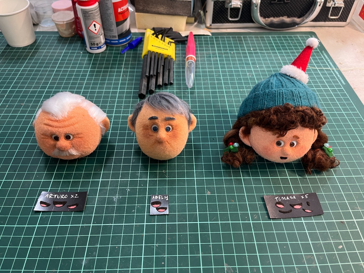 Cuando las estructuras estuvieron listas, comenzaron a darles cuerpo. Se cubrieron con espuma para generar volumen y se personalizaron con una capa de detalles manuales. Así, la indumentaria de cada figura incluía elementos diminutos como botones, bolsillos o costuras que, aunque apenas son visibles en pantalla, completan la identidad de cada personaje. Los complementos como el calzado, gorros, bufandas o gafas se modelaron en materiales como silicona o fieltro. Las cabezas se diseñaron en digital, se imprimieron en 3D y después se recubrieron. El cabello se hizo a mano pelo a pelo y cada personaje contó con varias bocas imantadas que se iban cambiando según la expresión del fotograma. Los ojos también eran móviles, así que todo el material del rodaje se organizó en el taller con un método casi quirúrgico a base de cajas etiquetadas, accesorios clasificados por personaje y un control exhaustivo de cada pieza.