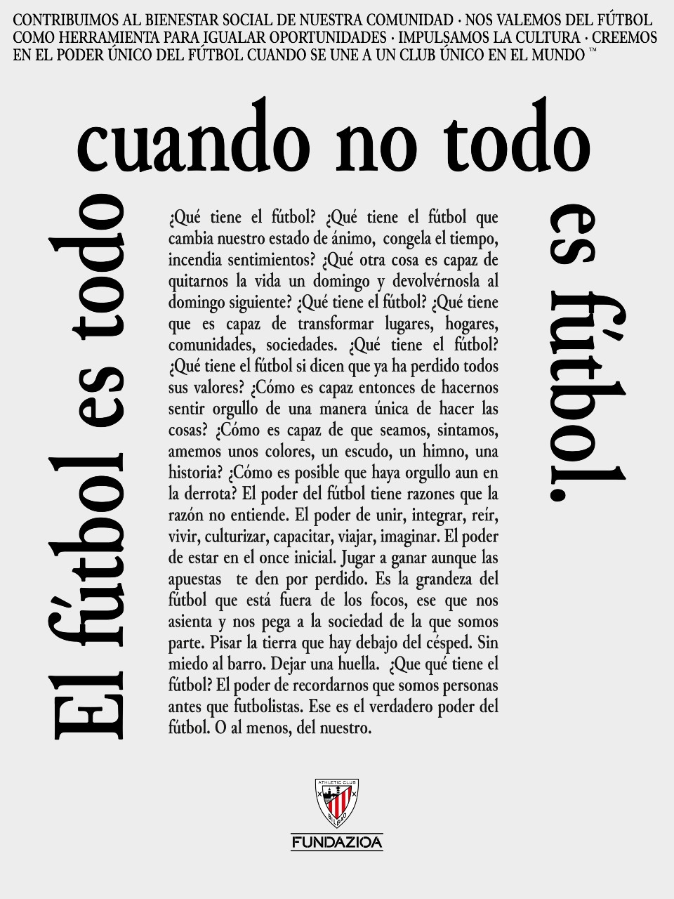 Athletic Club Fundazioa ha presentado su nueva plataforma de comunicación bajo el concepto “El fútbol es todo cuando no todo es fútbol”, una propuesta que busca reforzar el papel del deporte como herramienta de transformación social. Desarrollada junto a la agencia creativa MUY, la iniciativa marca una nueva etapa estratégica para la Fundación, estructurada en torno a tres ejes: comunidad, inclusión y cultura.