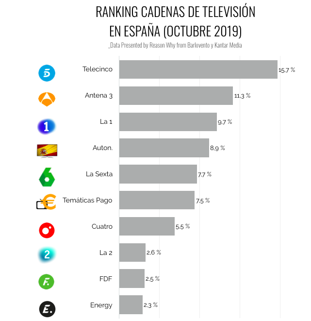 Telecinco consolida su posición en lo más alto del ranking de audiencias televisivas en España. Ya van catorce meses consecutivos en los que es la cadena más vista, pero es que además este mes ha vuelto a conseguir récord con su mejor octubre de los últimos 10 años. En concreto, hablamos del 15,7% del share según el informe de audiencias de Barlovento.