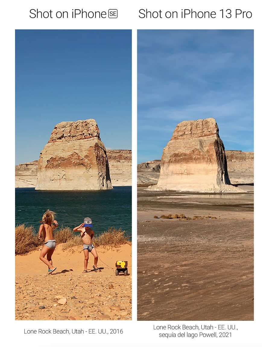 Las imágenes de “antes y después”, y también en formato time-lapse en vídeo, ponen el foco en fenómenos como el deshielo de glaciares, las sequías extremas y las inundaciones. Estos han transformado el paisaje global en el periodo en que los fabricantes han ido sacando nuevos modelos de teléfonos móviles al mercado.
