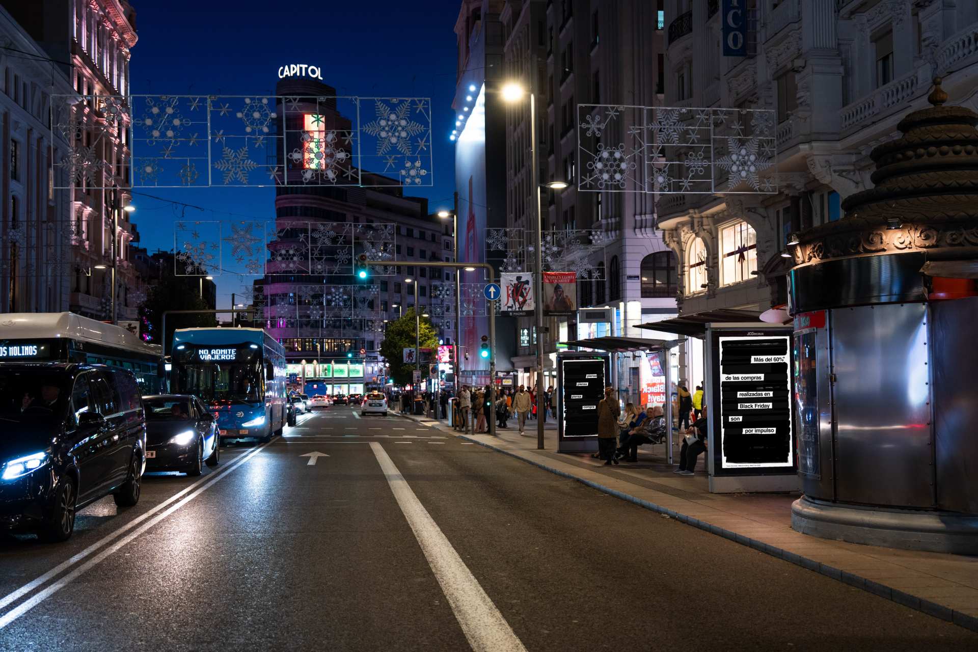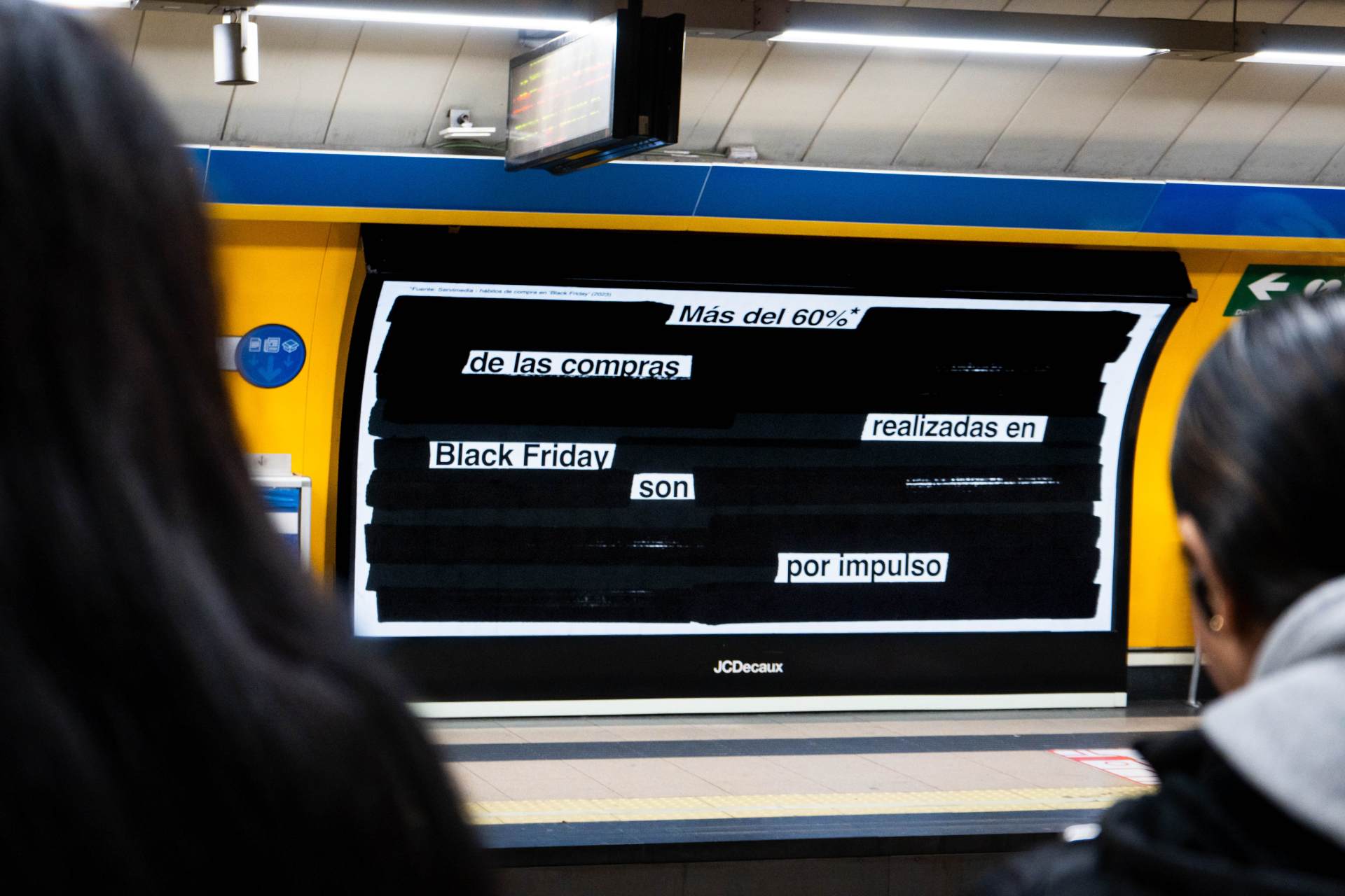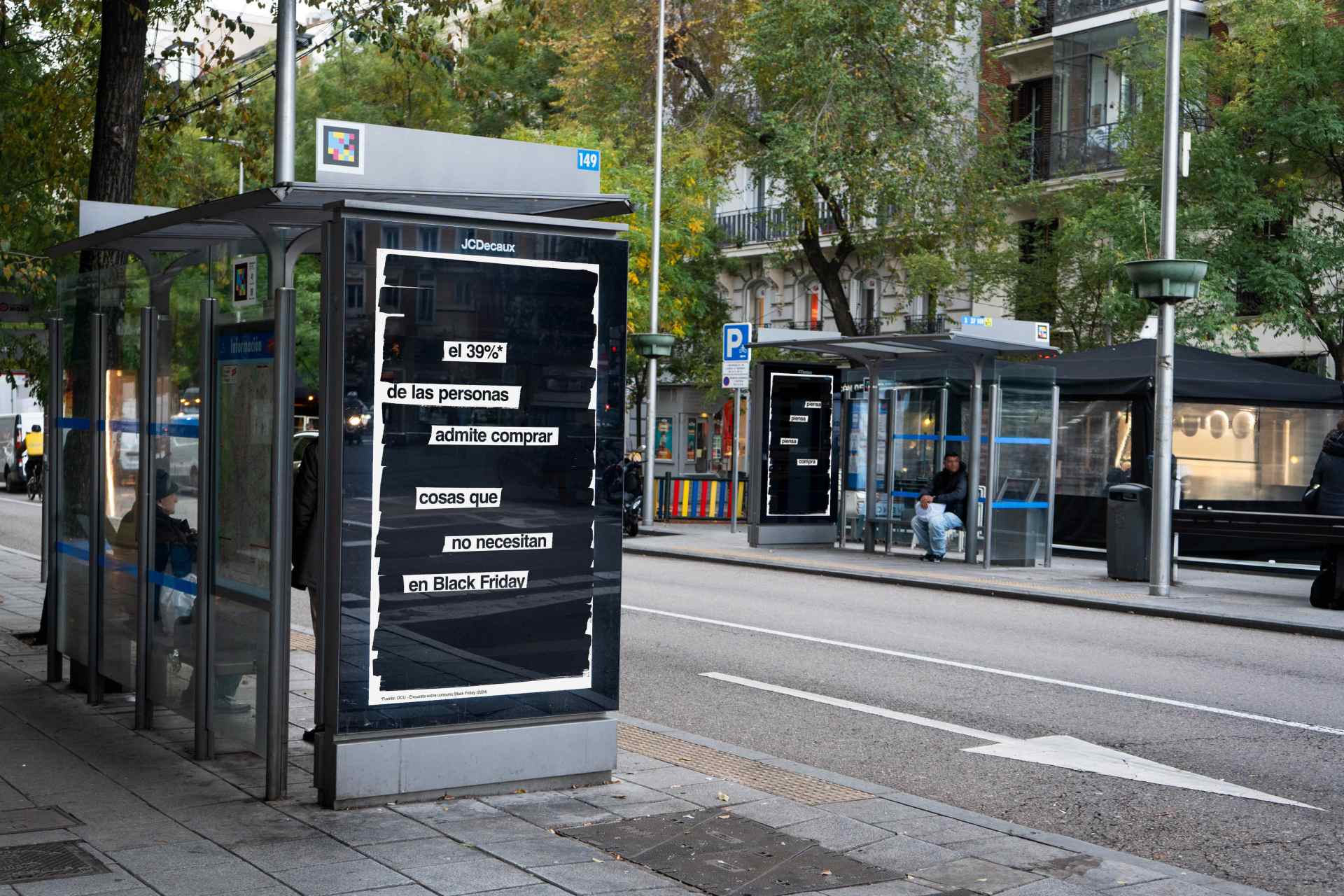 Así, el pasado 17 de noviembre desplegó un “silencio visual” en algunos de los puntos más comerciales de Madrid, a través de creatividades de publicidad exterior con un diseño sobrio y monocromático que pretendían reducir la saturación publicitaria del entorno. Las piezas, a modo de textos tachados, dejaban al descubierto mensajes como “El 39% de las personas admite comprar cosas que no necesitan en Black Friday”, “Más del 60% de las compras realizadas en Black Friday son por impulso”, o “Piensa, piensa, piensa, compra”.