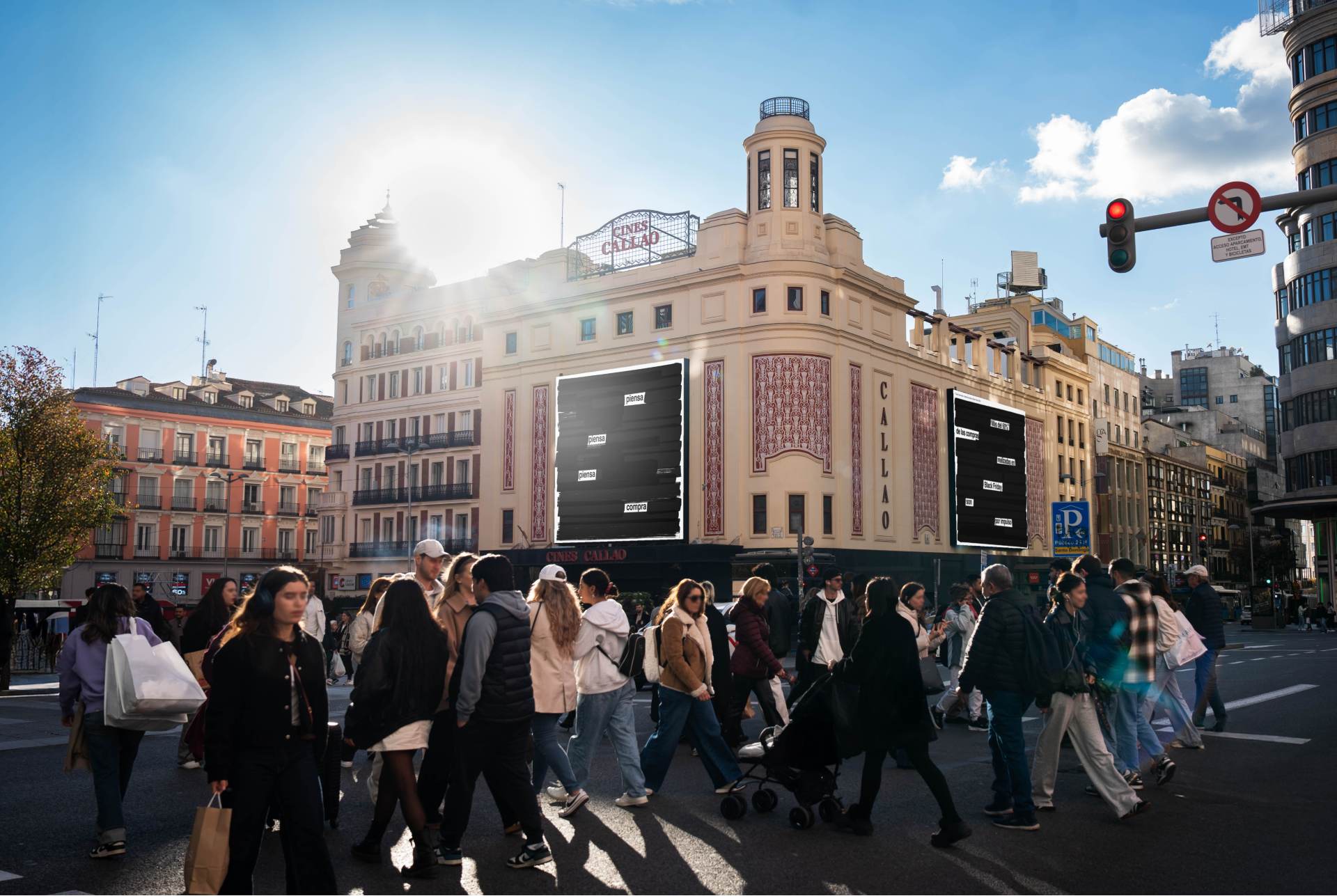 Las gráficas se activaron en pantallas digitales de Callao, mupis en Gran Vía y Fuencarral, lonas de gran formato en Ronda de Atocha y soportes publicitarios de Metro. La intención de B100, tal y como explican desde la agencia en un comunicado, no ha sido eliminar la publicidad, sino interrumpirla dando un respiro visual y motivando un cambio de mentalidad.