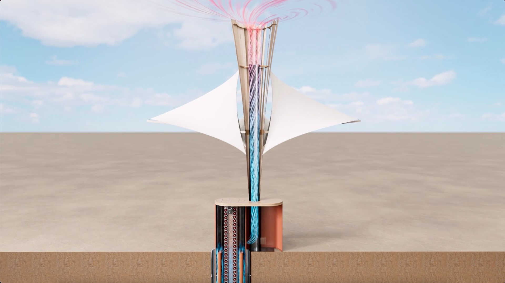 “Para esta innovación hemos modernizado una tradicional solución de refrigerado subterráneo y la hemos llevado un poco más lejos” dice Babatope Aiku, Ingeniero de Sostenibilidad en Frog. “Lo que hemos hecho es enterrar a 4 metros de profundidad, donde el aire se refresca por evaporación, nueve cilindros de arcilla para colocar las bebidas. Son cilindros de alto rendimiento que hacen que la circulación de aire se duplique y el efecto se acentúa gracias a la corriente de aire que llega a través de un mástil de 4,5 metros de alto, en un proceso que se denomina el Efecto Venturi: el aire frío sobre la superficie simplemente fluye por el tubo directamente al subsuelo".