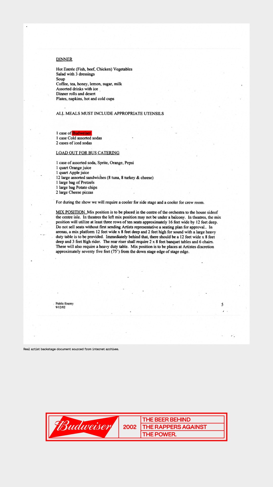 La idea de la agencia creativa Africa Creative -parte de la red DDB Worldwide-, explora el conocido carácter exigente de muchos artistas para demostrar que entre sus particulares solicitudes siempre ha estado presente Budweiser. Para ello ha revisado documentos de producción de diferentes conciertos de las últimas décadas en los que aparece su producto y los convirtió en una campaña de publicidad exterior.