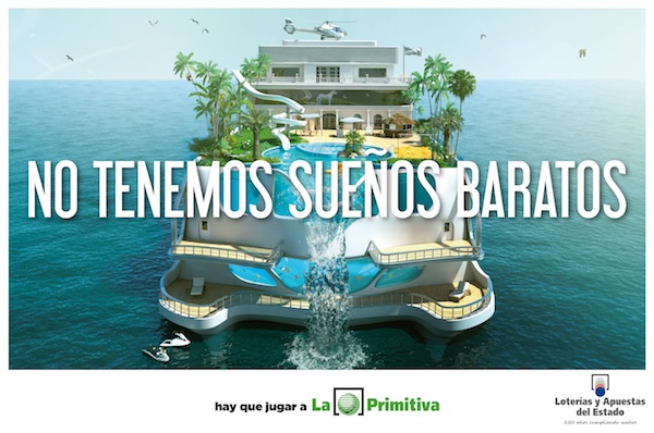 La gráfica de esta campaña representa el sueño medio del jugador de la lotería español: un yate con una selva a bordo, un helicóptero, un tobogán, una cascada, motos de agua... el más absoluto lujo.