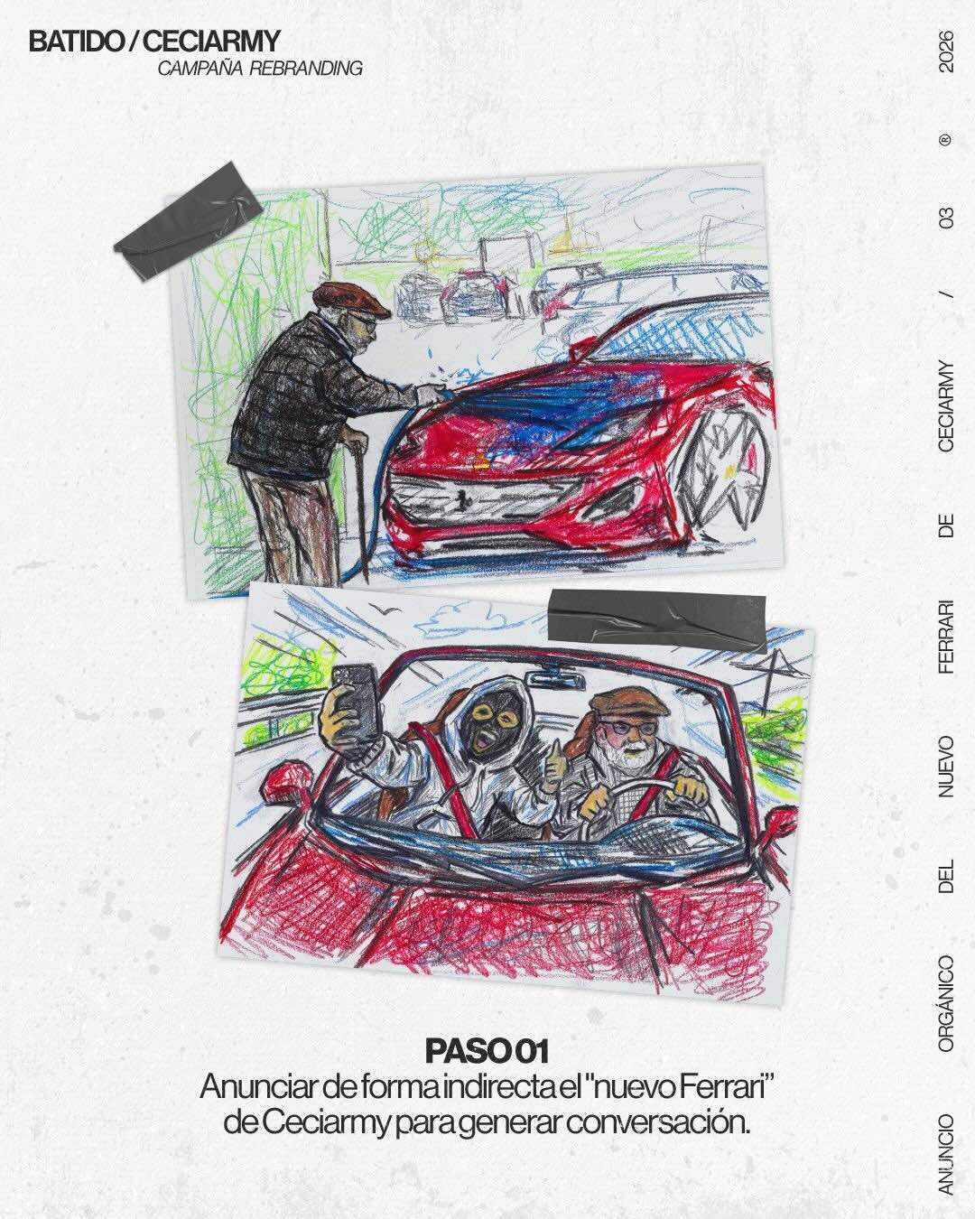 La estrategia ha consistido en el desarrollo de un storytelling alrededor del nuevo coche de Ceciarmy, un Ferrari. En un primer vídeo se podía ver al creador lavando el vehículo y conversando con un hombre mayor que admiraba el modelo. Motivado por el entusiasmo del hombre, y reflejando la nueva etapa que Ceciarmy está emprendiendo, decide hacer realidad sus deseos y le permite conducir el coche.