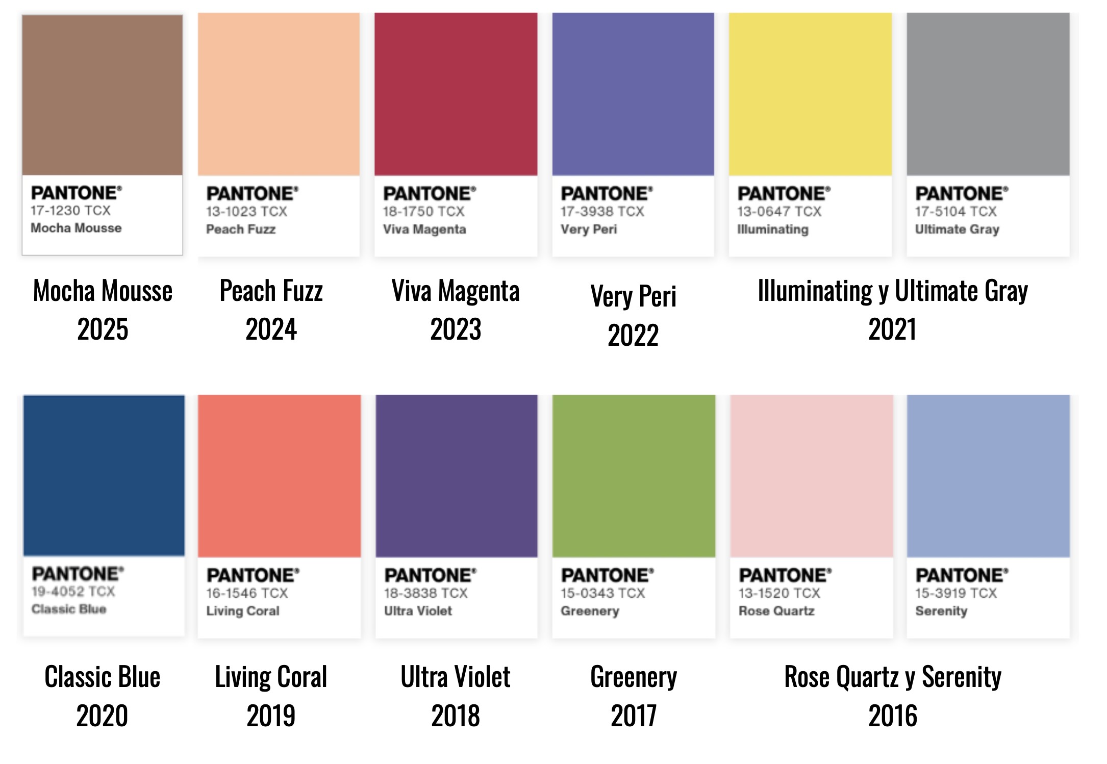 El primer Color Pantone del Año fue Cerulean Blue, y tras él han venido más de dos decenas de colores. En los últimos años se ha seleccionado Classic Blue (2020), Ultimate Gray e Illuminating (2021), Very Peri (2022), Viva Magenta (2023), Peach Fuzz (2024) y Mocha Mousse (2025).