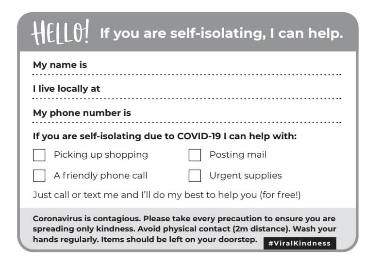 No toda la comunicación gráfica en relación al coronavirus procede de las instituciones o de las grandes empresas. Los ciudadanos también están participando en iniciativas, como #ViralKindness (amabilidad viral), gracias a sus conocimientos y habilidades en diseño y su voluntad de contribuir al bien común. Tal es el caso de Becky Wass, una profesora de Reino Unido que ha diseñado una tarjeta de presentación para aquellos voluntarios que ofrezcan su tiempo y servicios para ayudar a personas contagiadas por el COVID-19. La tarjeta, que además incluye instrucciones cautelares básicas, está disponible en redes sociales y en un documento para que aquellos interesados la impriman y peguen en sus domicilios.
