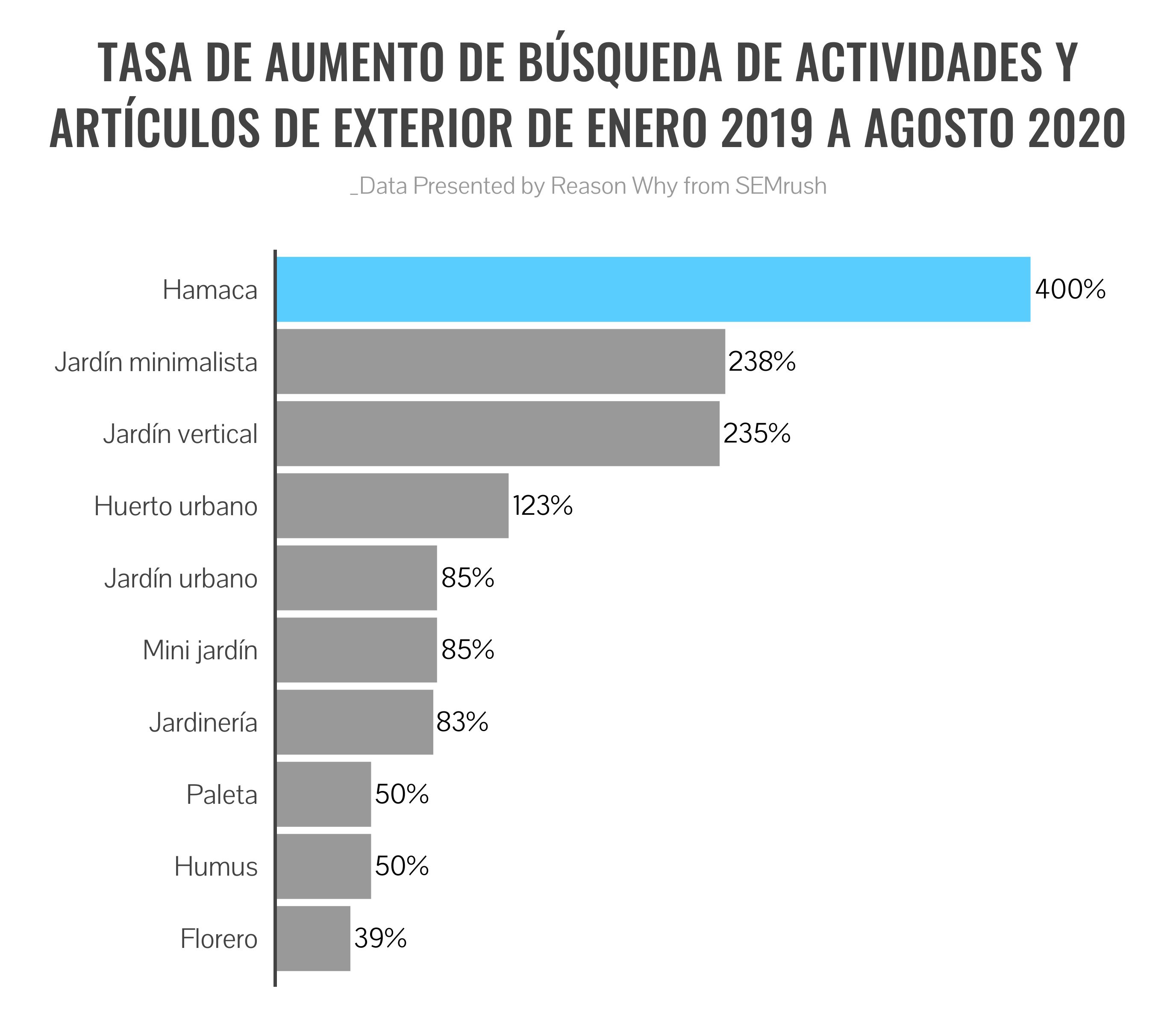 El análisis realizado por SEMrush muestra que los españoles también buscan mejorar su nivel de estrés y ocupar su tiempo libre. Términos como “hamaca”, han experimentado un aumento del 400% desde enero de 2019, seguido de cerca por la búsqueda de “jardín minimalista”, que crece casi un 240%, o “jardín vertical” que incrementa el número de registros de búsqueda los últimos ocho meses en casi un 235%.