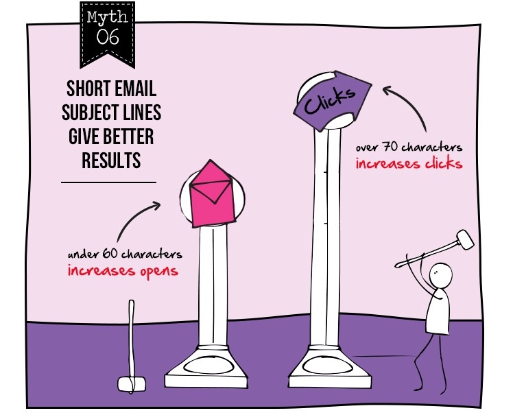 LA REALIDAD: es cierto que los asuntos cortos consiguen que más usuarios abran el email. Pero en realidad, los asuntos largos, de 70 caracteres o más, consiguen más clics hacia la web de la marca.