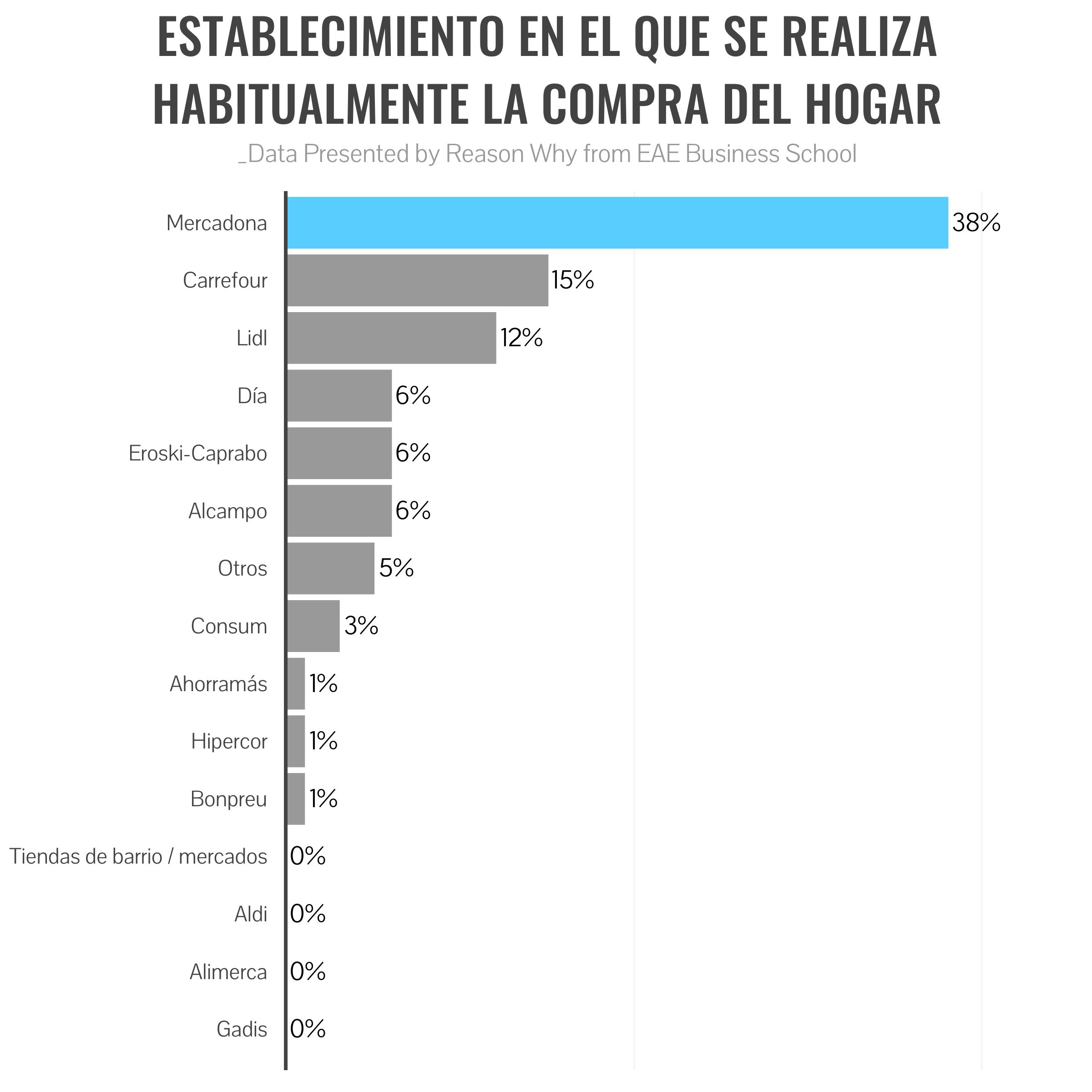El menor número de casos de compras del hogar lo encontramos en establecimientos de carácter regional o local como Gadis (0.5%), Alimerka (0.7%) y Tiendas de barrio/Mercados (0.8%). En este grupo también encontramos a Aldi (0.8%). En medio de ambos grupos y con porcentajes del 5.7% y 6.3% de preferencia están Dia, Eroski y Alcampo.