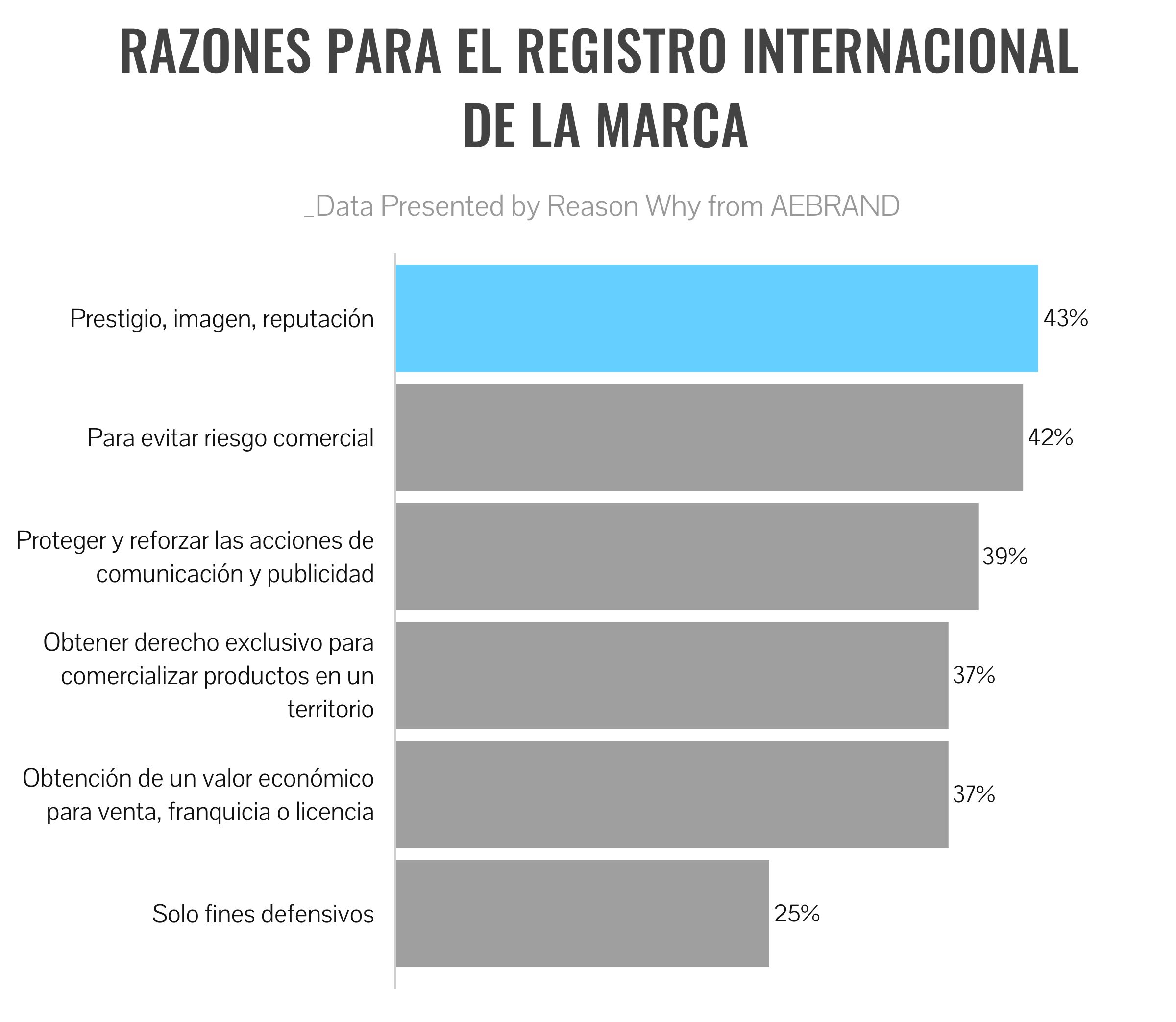 Por otro lado, el informe de AEBRAND ha analizado la situación de la protección de la marca. El 36% de los participantes en el análisis apuntan que registran internacionalmente todas las marcas en todos los mercados en los que la empresa está presente, frente al 30% que solo lo hace con la marca principal u otro 30% que únicamente lo hace en mercados clave. El prestigio, la reputación y la imagen (43%) y evitar el riesgo comercial (42%) son las principales razones para registrar la marca.
