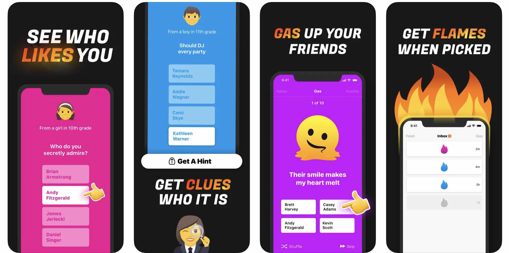 El funcionamiento se basa en preguntas lanzadas por Gas, todas ellas positivas, como "¿Quién es más probable que se disfrace como el emoji de caca para Halloween?", con el objetivo de instar a los adolescentes a felicitarse entre sí o a animarse mutuamente. Cuando el nombre del usuario ha sido seleccionado en las encuestas, se reciben notificaciones en forma de llamas para avisar a las personas y hacerles saber que fueron elegidas.