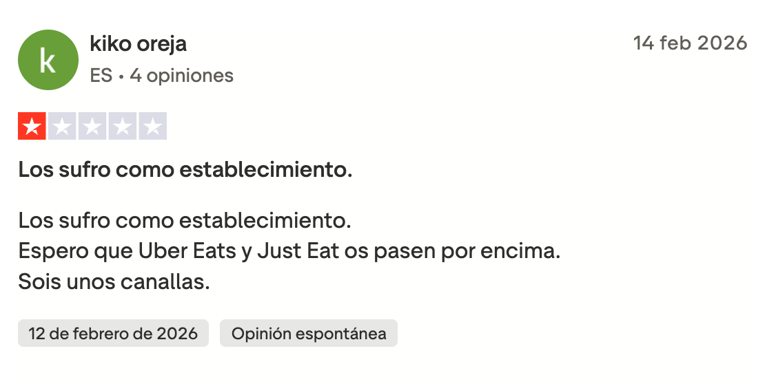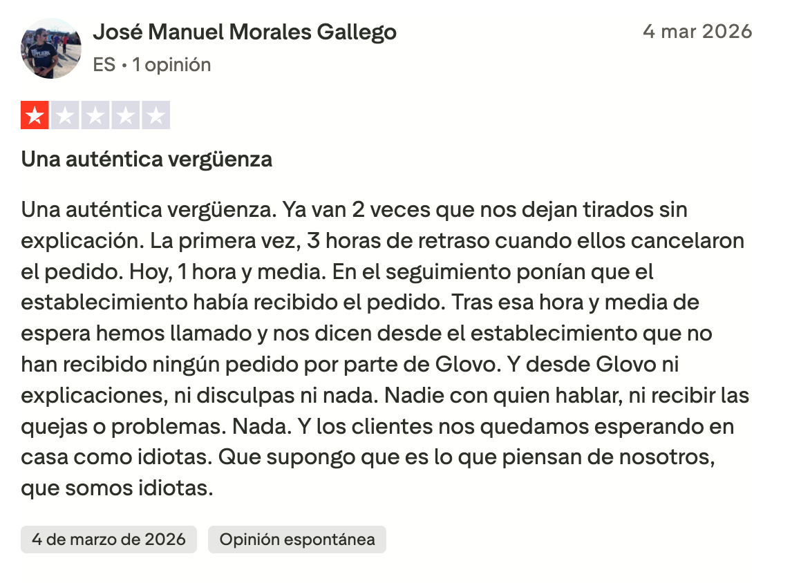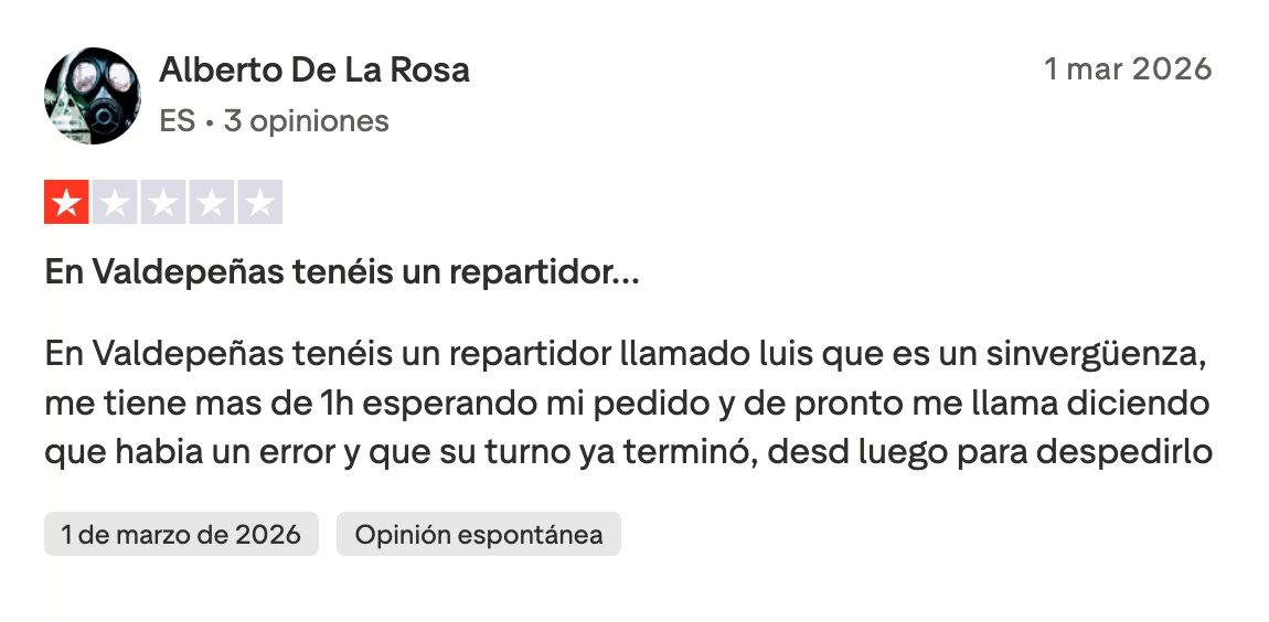 Algunas reseñas recientes reflejan ese malestar: “Si pudiera ponerles menos 100 estrellas, lo haría. Ya van cuatro veces que hago un pedido y me lo cancelan. El problema es que me lo cobran y a quién reclamas. Pésimo servicio”, señala una usuaria en una reseña publicada este mes de marzo. “No es la primera vez que pedimos y el repartidor no aparece o aparece casi dos horas después cuando la app decía 35 minutos”, comenta otra clienta en una valoración publicada en enero. “Más de una hora esperando mi pedido y al final me llaman diciendo que el turno del repartidor había terminado”, reclama otro usuario.