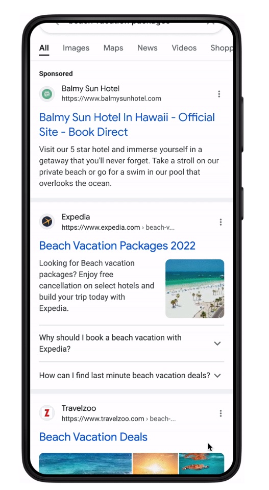 Junto a los nombres y los favicons, la tecnológica también ha anunciado cambios para la etiqueta identificativa de los anuncios. Hasta el momento, la publicidad search, ya fuera en móviles o en escritorio, aparecía señalada con la palabra “Anuncio” al lado del enlace de la página de destino del anuncio. De ahora en adelante, cuando los anuncios se muestren en los resultados de búsqueda para dispositivos móviles, estarán etiquetados con la palabra "Patrocinado" en negrita y en negro, y aparecerá en su propia línea en la esquina superior izquierda de los anuncios de búsqueda.