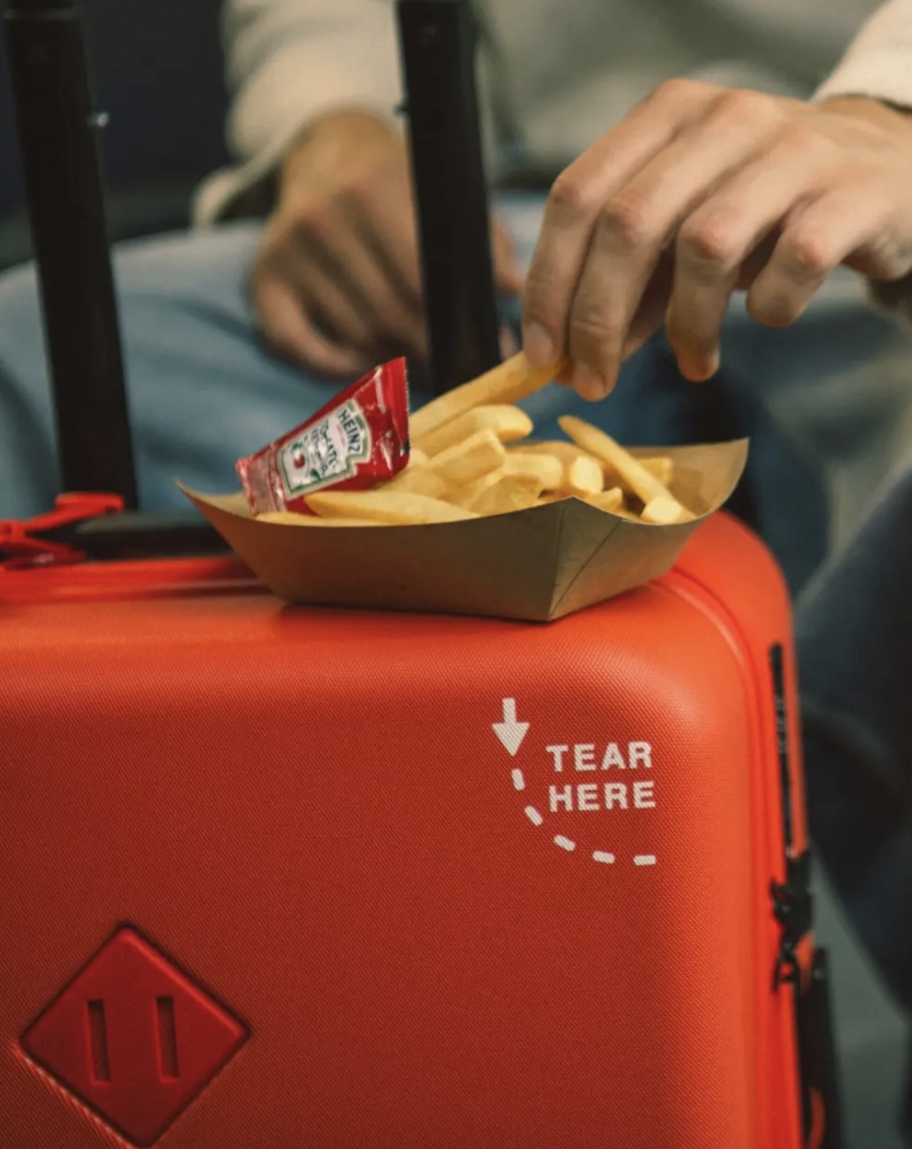 Las dos maletas se presentan en un llamativo color rojo que alude al kétchup de Heinz, e incluyen también otros detalles de diseño únicos inspirados en la salsa, como el diseño de la línea de puntos que indica dónde abrir los sobres de condimento; un estampado interior con la imagen de dicho formato, o una correa y etiqueta de equipaje extraíbles con la forma de un icónico sobre de kétchup Heinz.