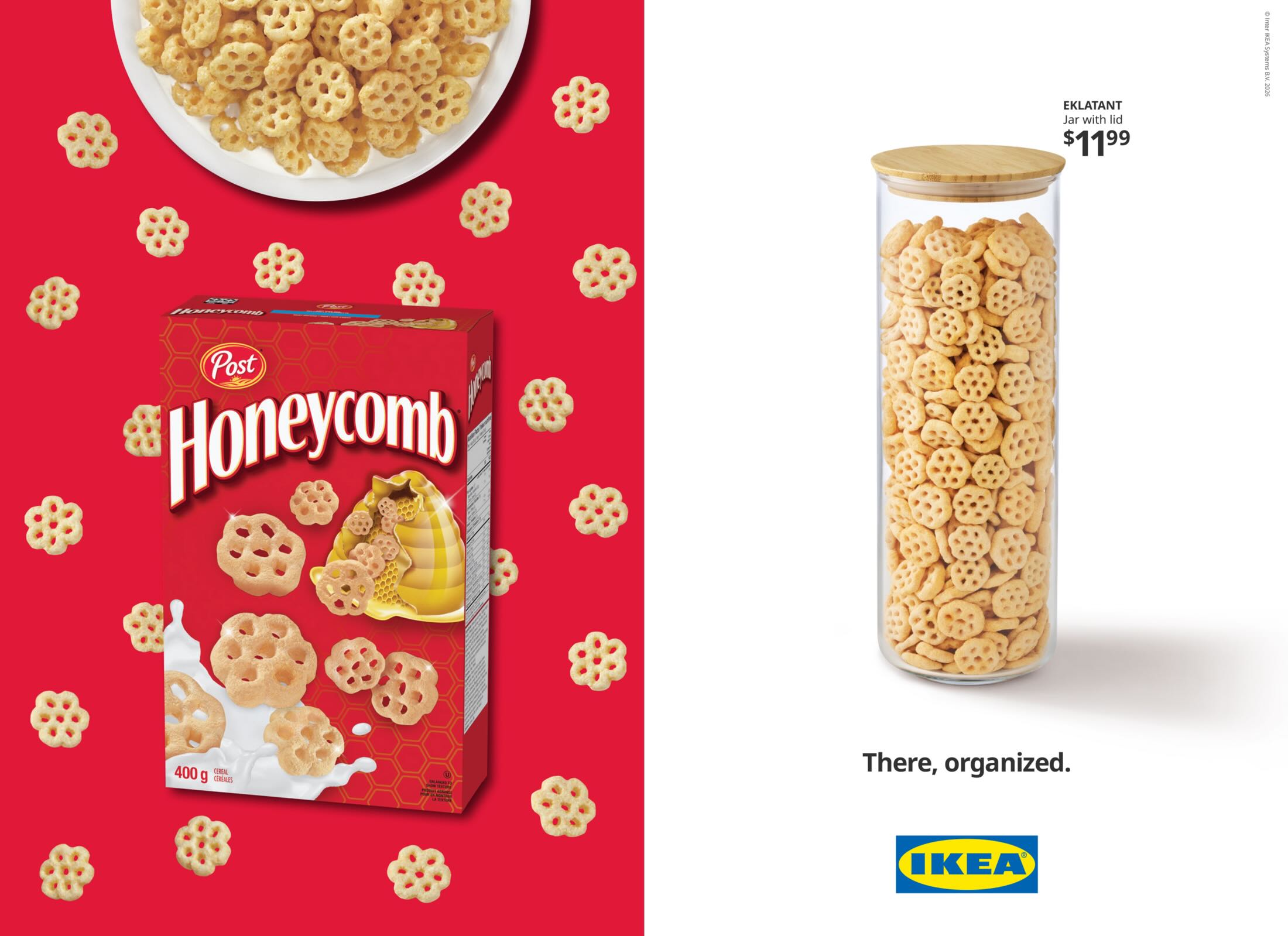Al organizar las llamativas creatividades de otras marcas utilizando sus artículos de almacenamiento, Ikea traslada el mensaje de que en su catálogo cuenta con todo lo que los consumidores necesitan para llevar orden, calma y felicidad a sus cocinas. Las piezas incluyen el claim “There, organized” (Así, organizado), enfatizando la sensación de calma visual.