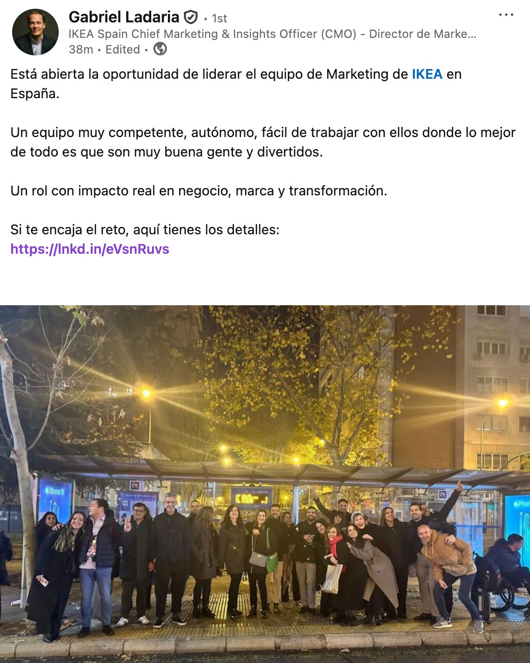La salida de Gabriel Ladaria de Ikea hacia ING empieza a materializarse en la estructura de la compañía sueca. Tras casi dos décadas en la organización, el directivo ha comunicado mediante un post en Linkedin la apertura del proceso para cubrir la dirección de marketing en España, una posición estratégica en uno de los mercados más relevantes para la marca en Europa.