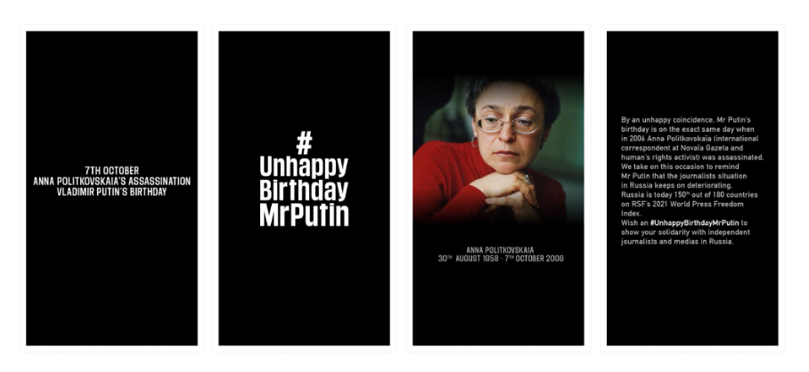 Esta semana se cumplen quince años del asesinato de Politkovskaya y la organización internacional de periodistas Reporteros Sin Fronteras (RSF) ha puesto en marcha, aprovechando la coincidencia de fechas, una iniciativa internacional titulada “Infeliz cumpleaños, Sr. Putin” en la que ha contado con la creatividad de la agencia francesa BETC.