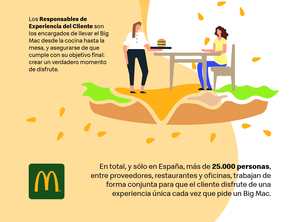 - Restaurantes: entrenadores y encargados de cada turno así como los empleados de cocina tienen un papel decisivo en la elaboración del Big Mac. Entre todos ellos, destaca la figura del responsable de experiencia de cliente cuyo objetivo es garantizar que los clientes disfruten al máximo