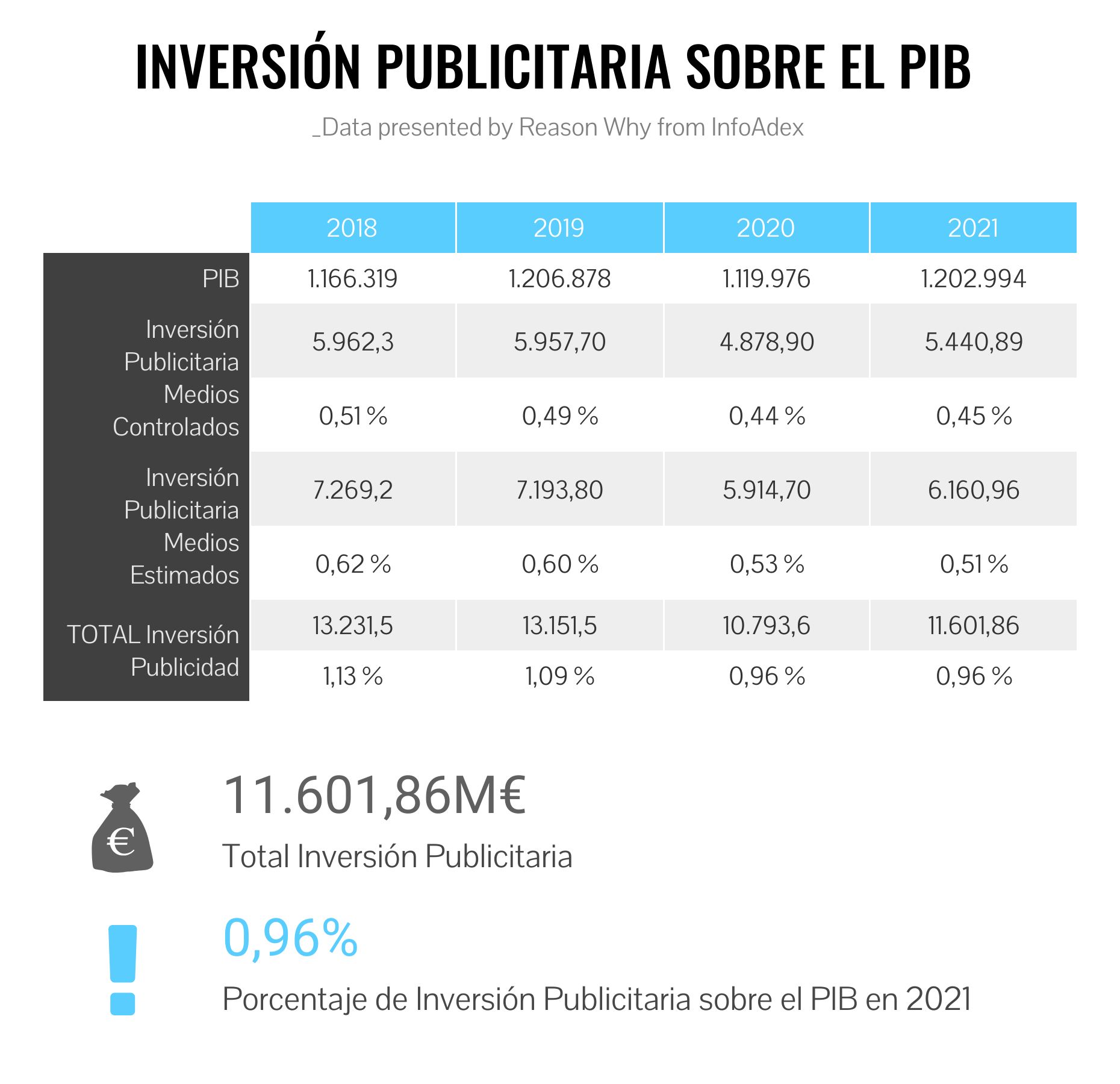 Según el Estudio InfoAdex 2022 sobre Inversión Publicitaria en España, la inversión en publicidad ha continuado representando menos del 1% del PIB de nuestro país en 2021. La cifra se ha situado, igual que el año anterior, en el 0,96%, lo que supone 11.601,86 millones de euros.